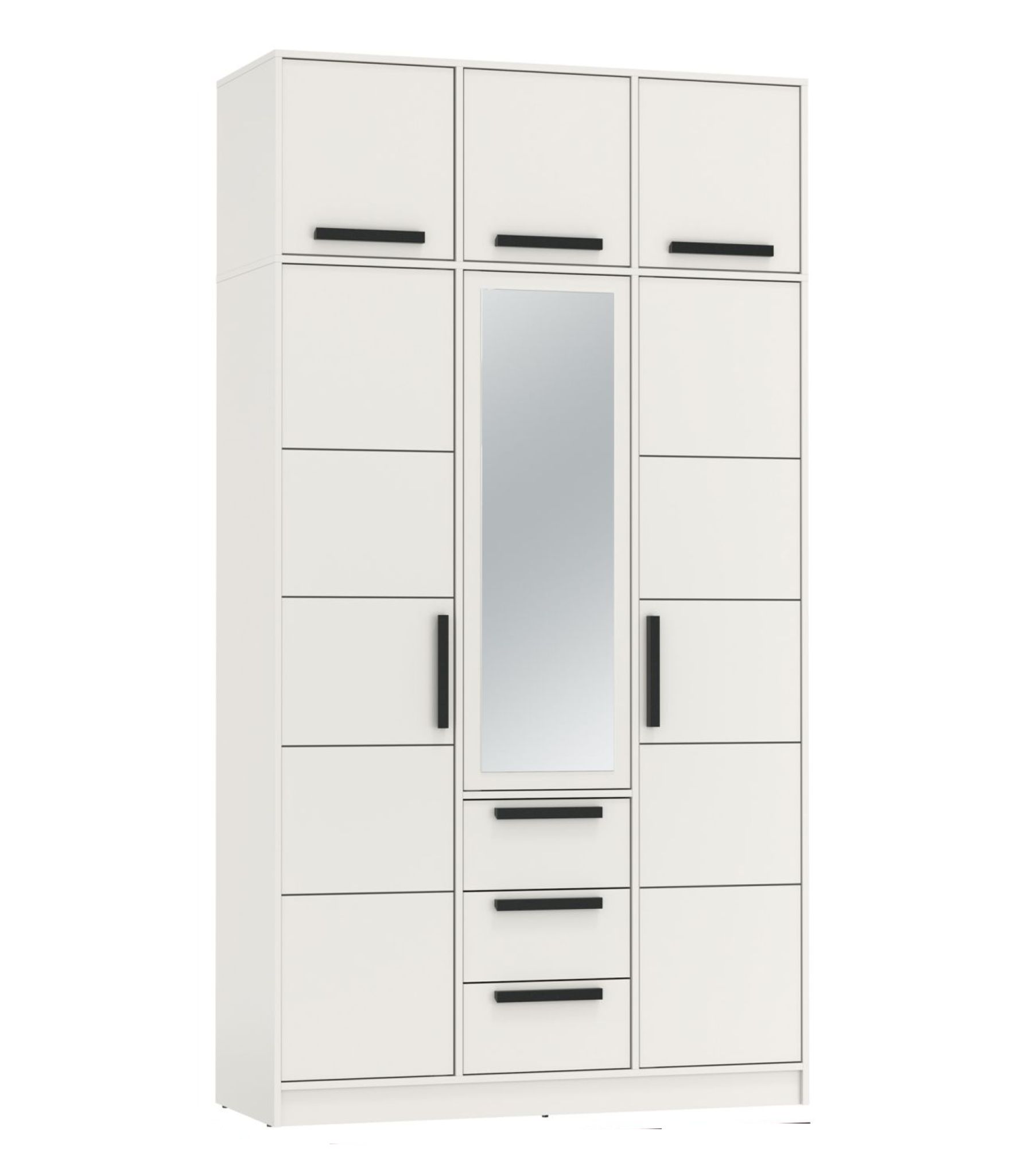 за тремя распашными дверцами. Фасад центральной двери шкафа - с зеркалом.