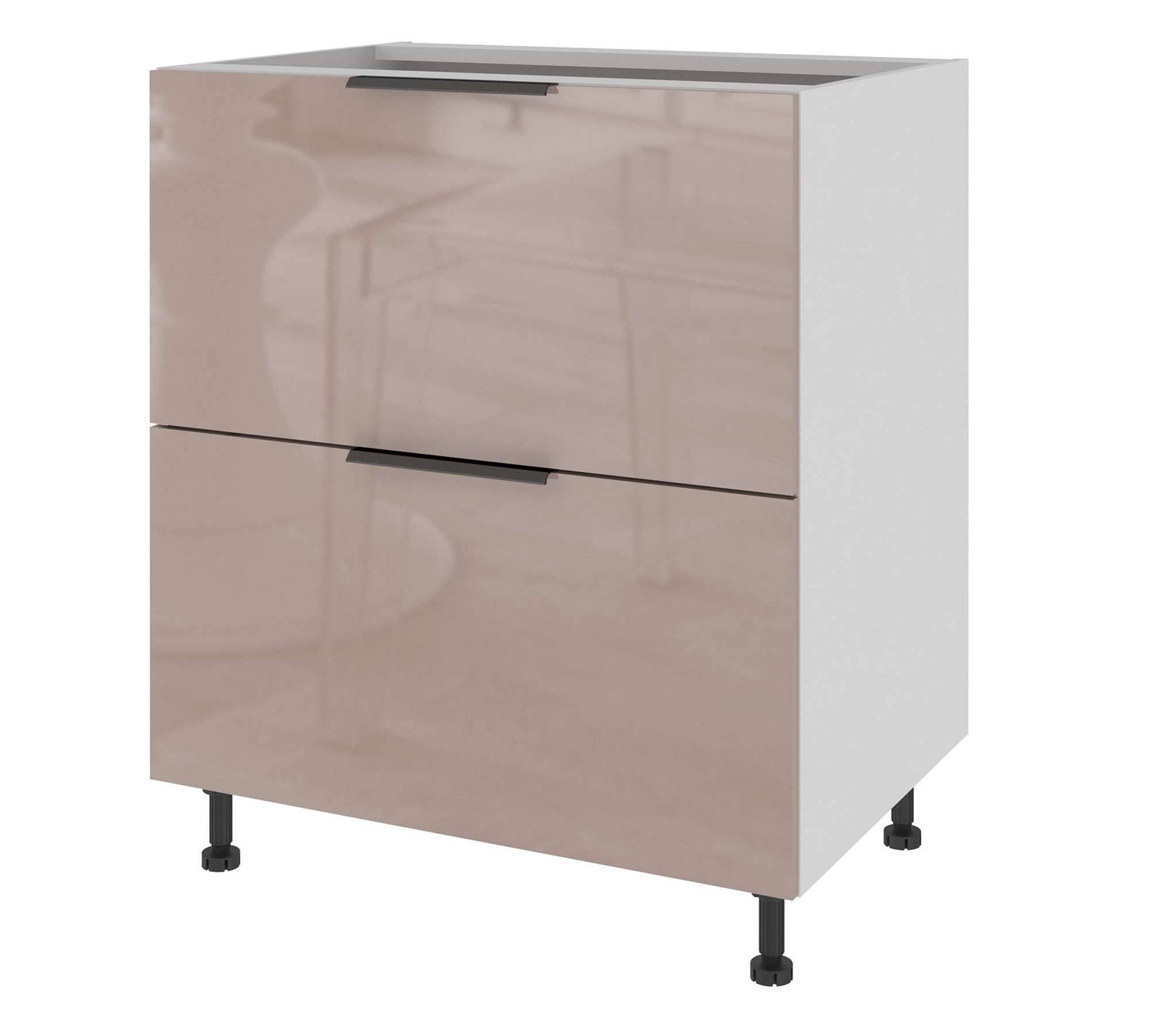 Высокоглянцевое покрытие (многослойная технология покрытия фасадов лаком). Опоры для тумб регулируемые высотой 100 мм. Цоколь белого цвета и Столешница приобретаются отдельно.