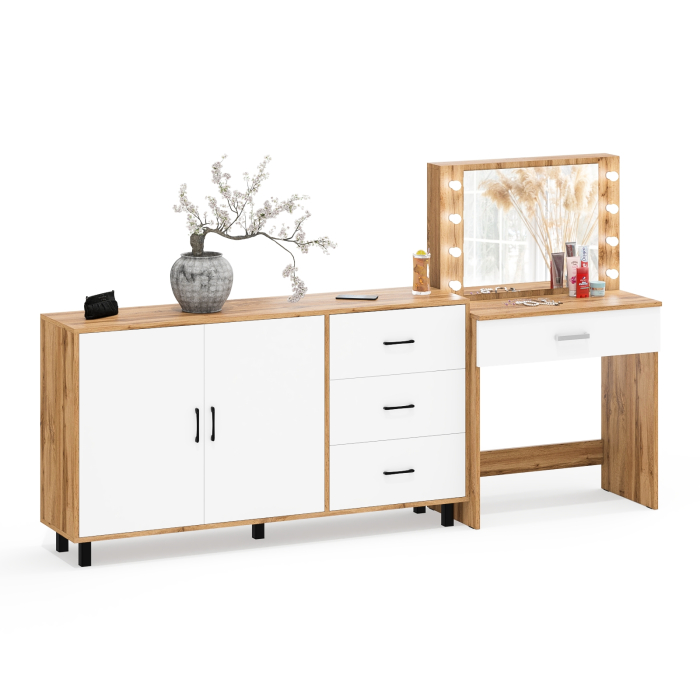 Комод-тумба 123-1604 и туалетный столик с подсветкой СТ-4 — элегантный комплект, в котором предусмотрено удобное хранение вещей и комфортное использование за счёт встроенной подсветки.