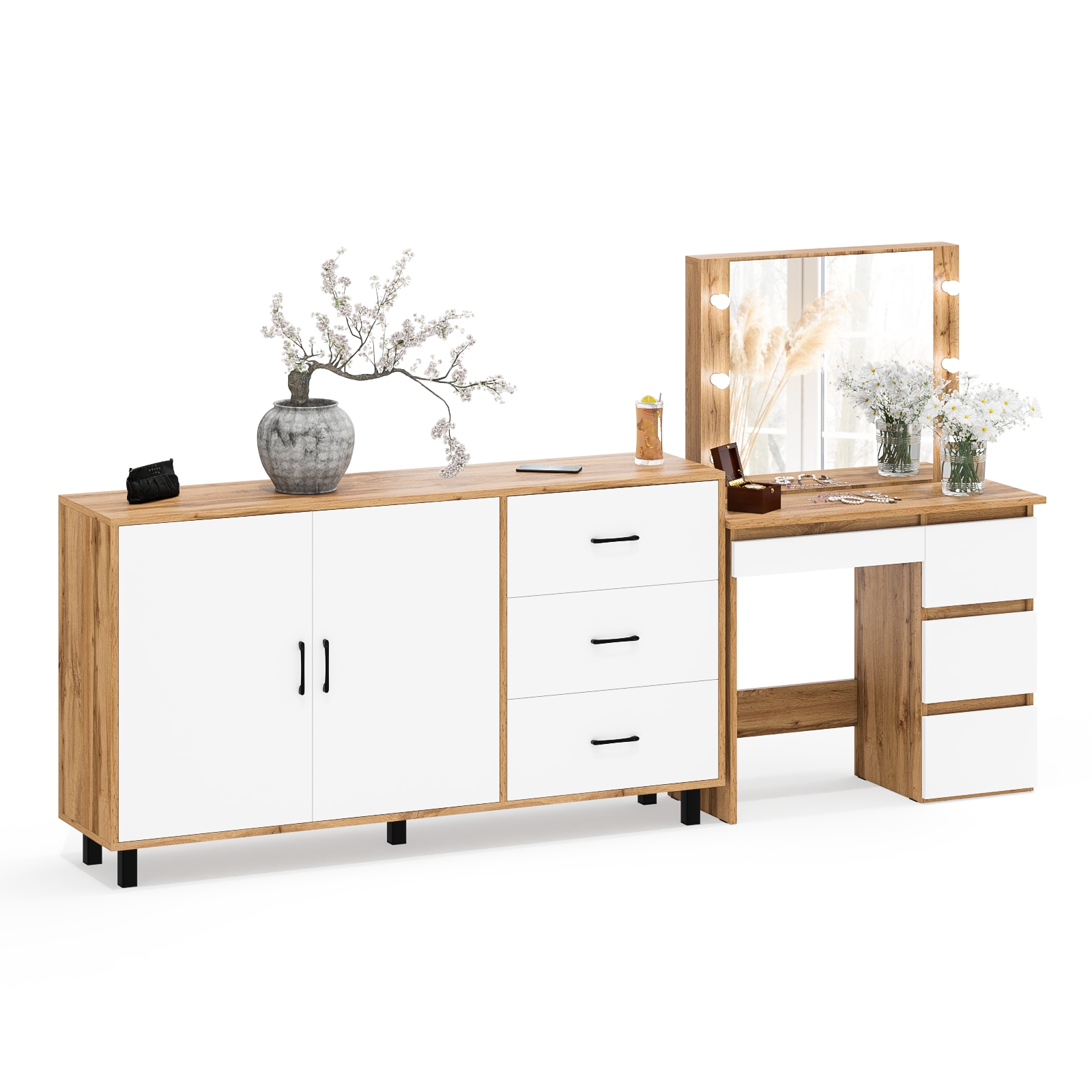 Косметический столик Сура с зеркалом и подсветкой и с тумбой-комодом 123-1604. Вместительная Тумба-комод и удобный столик с зеркалом и подсветкой создают комфортное пространство для хранения и ухода за собой.
