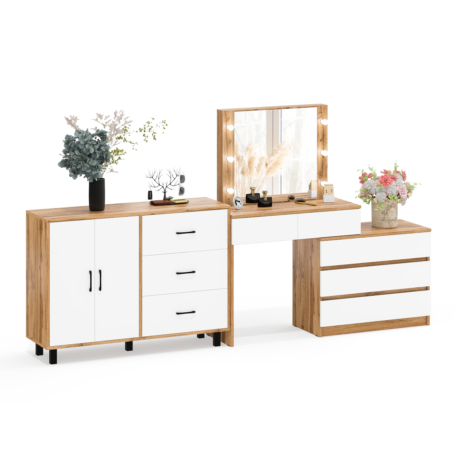 Стол косметический с подсветкой 110 и Тумба-комод с тремя ящиками и дверками 123-1204 – функциональное сочетание комода и столика с зеркалом и подсветкой создаёт удобное место для ухода за собой и хранения аксессуаров.