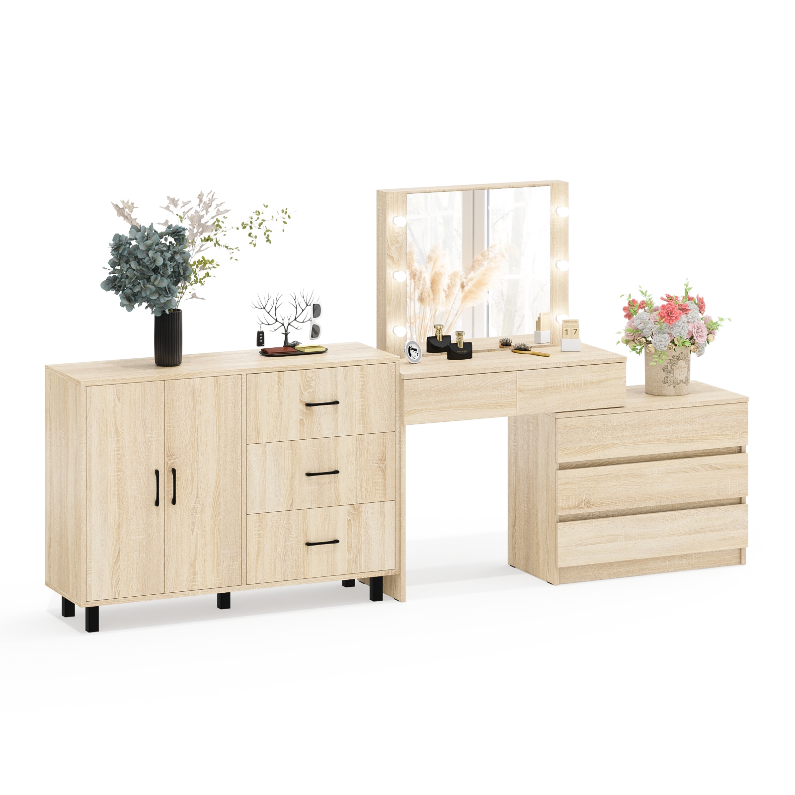Стол косметический с подсветкой 110 и Тумба-комод с тремя ящиками и дверками 123-1204 – функциональное сочетание комода и столика с зеркалом и подсветкой создаёт удобное место для ухода за собой и хранения аксессуаров.