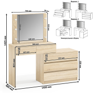 Столик СТ-110 представлен в двух вариантах исполнения – прямом и угловом, что позволяет выбрать оптимальную модель в зависимости от особенностей вашего помещения. Благодаря этому он легко интегрируется в любую планировку, создавая уютное и эргономичное пространство. Конструкция столика включает в себя панель с большим зеркалом (ШхВ) 59х59 см, которое визуально увеличивает пространство и помогает сосредоточиться на деталях макияжа. По бокам от зеркала предусмотрены отверстия для установки подсветки – по три с каждой стороны. Это позволяет установить лампочки, обеспечивающие яркое и равномерное освещение, которое так необходимо при создании безупречного образа. В комплекте уже есть всё необходимое для подключения подсветки - выключатель, пятиметровый провод, штепсельная вилка, прижимные кольца и шесть патронов E14. Лампочки с цоколем Е14 приобретаются отдельно. Это не только удобное решение, но и возможность создать атмосферу, которая будет максимально комфортной для Вас. Отсутствие лампочек в комплекте исключает риск их повреждения при транспортировке. Под просторной столешницей расположены два выдвижных ящика, которые плавно выдвигаются, обеспечивая легкий доступ к косметике и аксессуарам. Дополнительное пространство для хранения предоставляет вместительная тумба с тремя широкими ящиками, расположенная с одной стороны столика. Все ящики на шариковых направляющих обеспечивают комфортное использование и позволяют аккуратно организовать все необходимые вещи. Столик оснащен пластиковыми подпятниками.