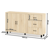 Комод 123-1604 может использоваться не только для хранения, но и как стильная ТВ-тумба. Комод оснащен продуманным функционалом - слева пара дверок (732х484 мм), за которыми есть полка. Справа три одинаковых выдвижных ящика. Размер фасадов ящиков составляет (242х570 мм), что обеспечивает достаточную вместимость. Ящики оборудованы шариковыми направляющими длиной 350 мм, что обеспечивает плавное и тихое выдвижение. Обратите внимание, что комод не имеет универсальной сборки - дверцы расположены только слева, а ящики – справа. Комод установлен на пять металлических опор черного цвета высотой 100 мм, придающие конструкции устойчивость и современный внешний вид. Для открывания дверей и ящиков используются металлические ручки 128 мм черного цвета.