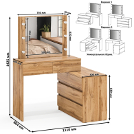 Столик СТ-110 представлен в двух вариантах исполнения – прямом и угловом, что позволяет выбрать оптимальную модель в зависимости от особенностей вашего помещения. Благодаря этому он легко интегрируется в любую планировку, создавая уютное и эргономичное пространство. Конструкция столика включает в себя панель с большим зеркалом (ШхВ) 59х59 см, которое визуально увеличивает пространство и помогает сосредоточиться на деталях макияжа. По бокам от зеркала предусмотрены отверстия для установки подсветки – по три с каждой стороны. Это позволяет установить лампочки, обеспечивающие яркое и равномерное освещение, которое так необходимо при создании безупречного образа. В комплекте уже есть всё необходимое для подключения подсветки - выключатель, пятиметровый провод, штепсельная вилка, прижимные кольца и шесть патронов E14. Лампочки с цоколем Е14 приобретаются отдельно. Это не только удобное решение, но и возможность создать атмосферу, которая будет максимально комфортной для Вас. Отсутствие лампочек в комплекте исключает риск их повреждения при транспортировке. Под просторной столешницей расположены два выдвижных ящика, которые плавно выдвигаются, обеспечивая легкий доступ к косметике и аксессуарам. Дополнительное пространство для хранения предоставляет вместительная тумба с тремя широкими ящиками, расположенная с одной стороны столика. Все ящики на шариковых направляющих обеспечивают комфортное использование и позволяют аккуратно организовать все необходимые вещи. Столик оснащен пластиковыми подпятниками.