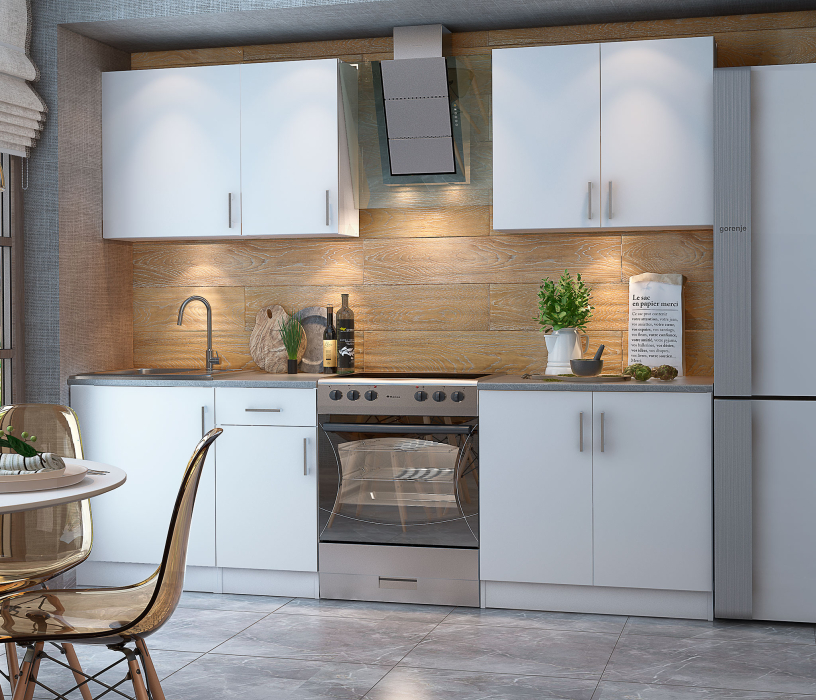 Каркасы и фасады элементов этого кухонного гарнитура выполнены – из ламинированной ДСП, которые надежно «держат» крепежи, петли и направляющие. Для изготовления столешницы использована влагостойкая ДСП, покрытая пластиками CPL и HPL, не впитывающими неприятные запахи и устойчивыми к резким температурным перепадам, негативным воздействиям влаги, агрессивных моющих средств и острых предметов.