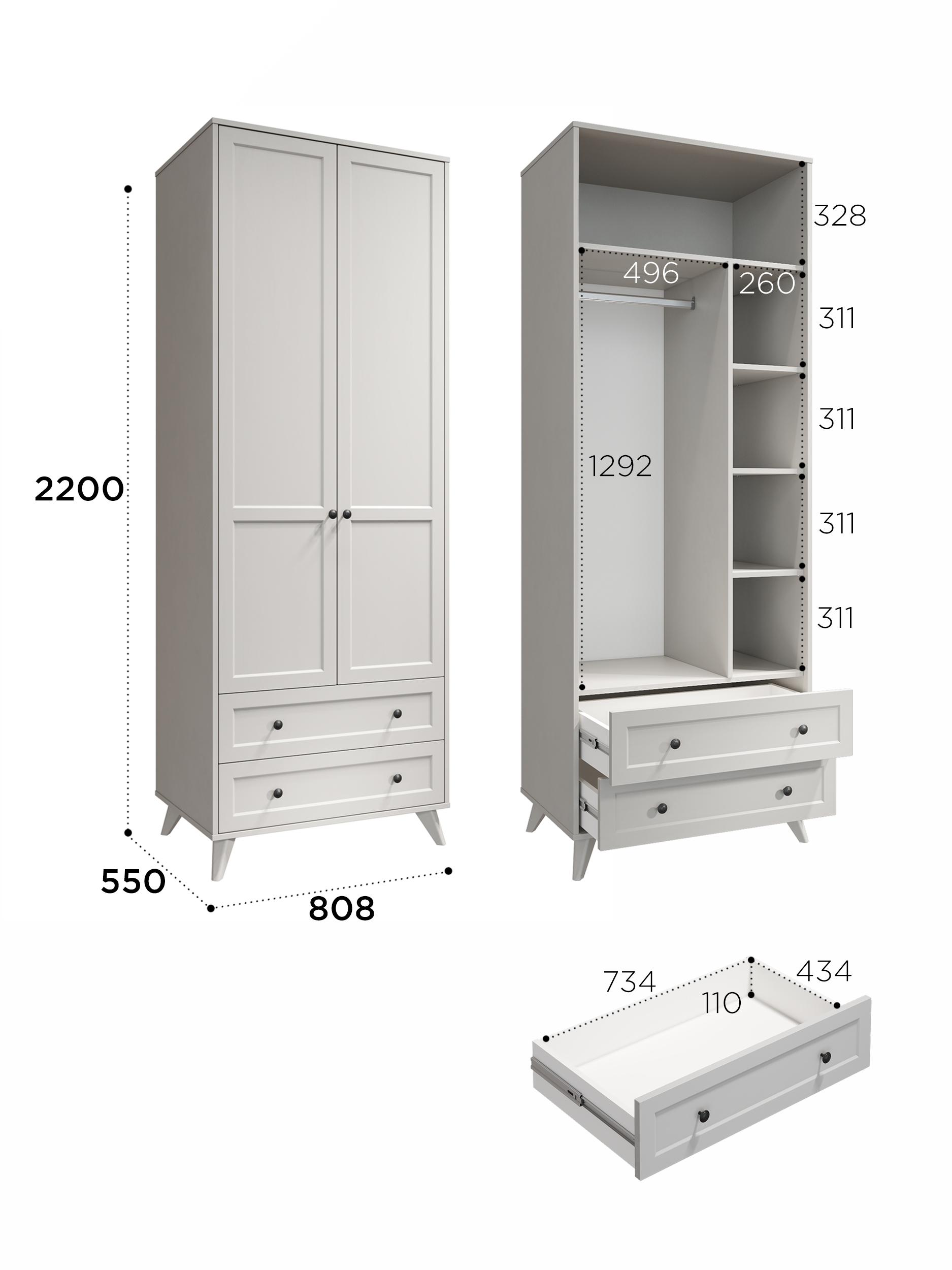 2 выдвижных ящика на телескопических направляющих полного выдвижения