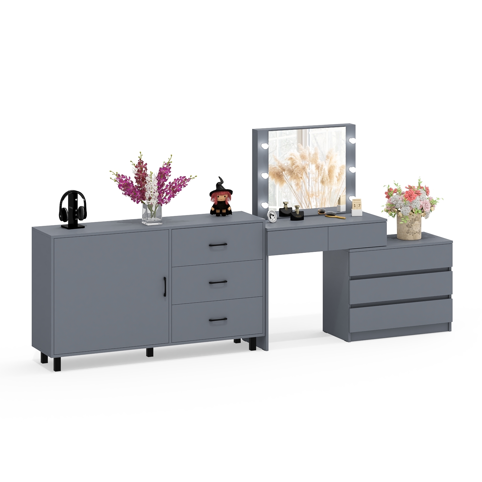 Стол-трансформер косметический с подсветкой 110 и комод-тумба три ящика 122-1504 — современный комплект мебели для спальни. Практичный комод и удобный угловой туалетный столик с зеркалом создают комфортное пространство для хранения и ухода.