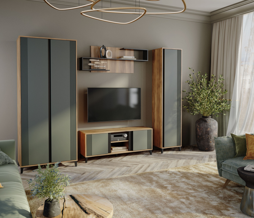 Стильная и современная модульная гостиная "Богемия" изготовлена из высококачественных материалов. Корпус изготовлен из ламинированной древесностружечной плиты толщиной 16мм. Фасады выполнены из МДФ толщиной 19мм и покрыты пленками ПВХ с эффектом Soft touch. Это обеспечивает не только стильный внешний вид, но и приятные тактильные ощущения. Цвета фасадов - зеленый и бежевый, гармонично сочетаются друг с другом и с корпусом мебели. Дизайн гостиной подчеркивает эффектный контраст материалов и цветов.