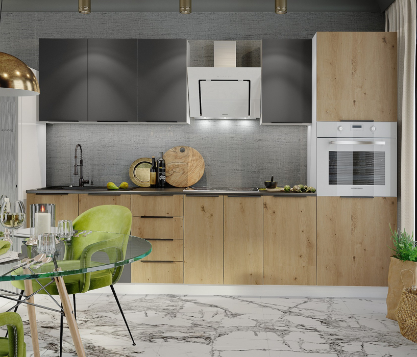 Модульная система Калипсо в двухцветном исполнении «Черный графит / Дуб дикий» с длиной 2,8 метра представляет собой вместительное и эстетически привлекательное решение для просторных кухонь. Сочетание благородного матового графита и аутентичной текстуры дикого дуба создает выразительную композицию, которая становится впечатляющим центральным элементом интерьера.