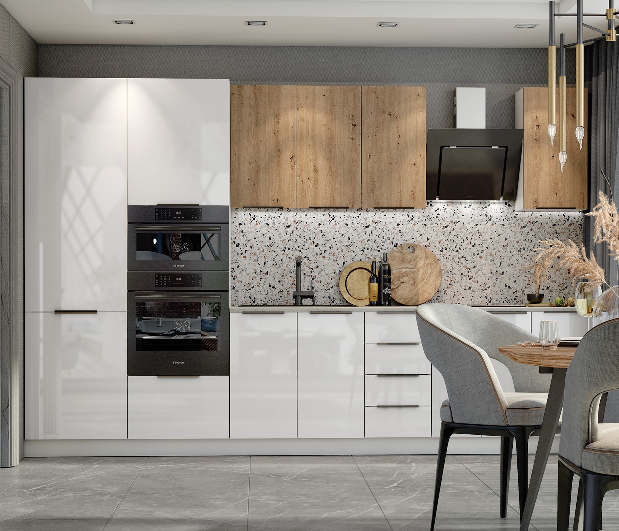 • Значительная длина 3,4 метра позволяет организовать несколько функциональных зон, оптимально распределив пространство для хранения, приготовления пищи и мытья посуды