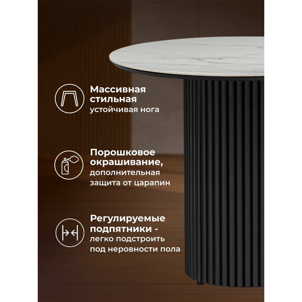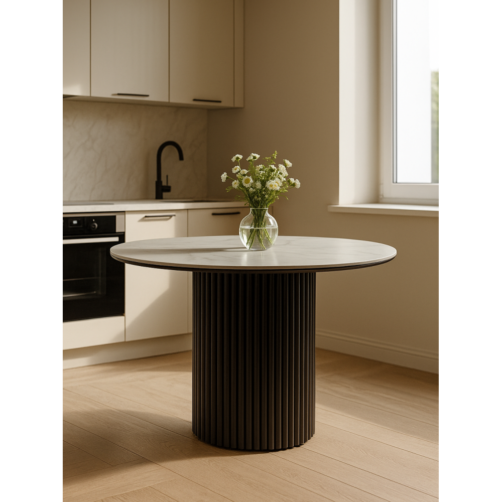 Круглая столешница создаёт гармоничную и уютную атмосферу, идеально подходит для компактных пространств. Отсутствие острых углов делает стол безопасным для семей с детьми, а плавные линии добавляют интерьеру мягкости и стиля.