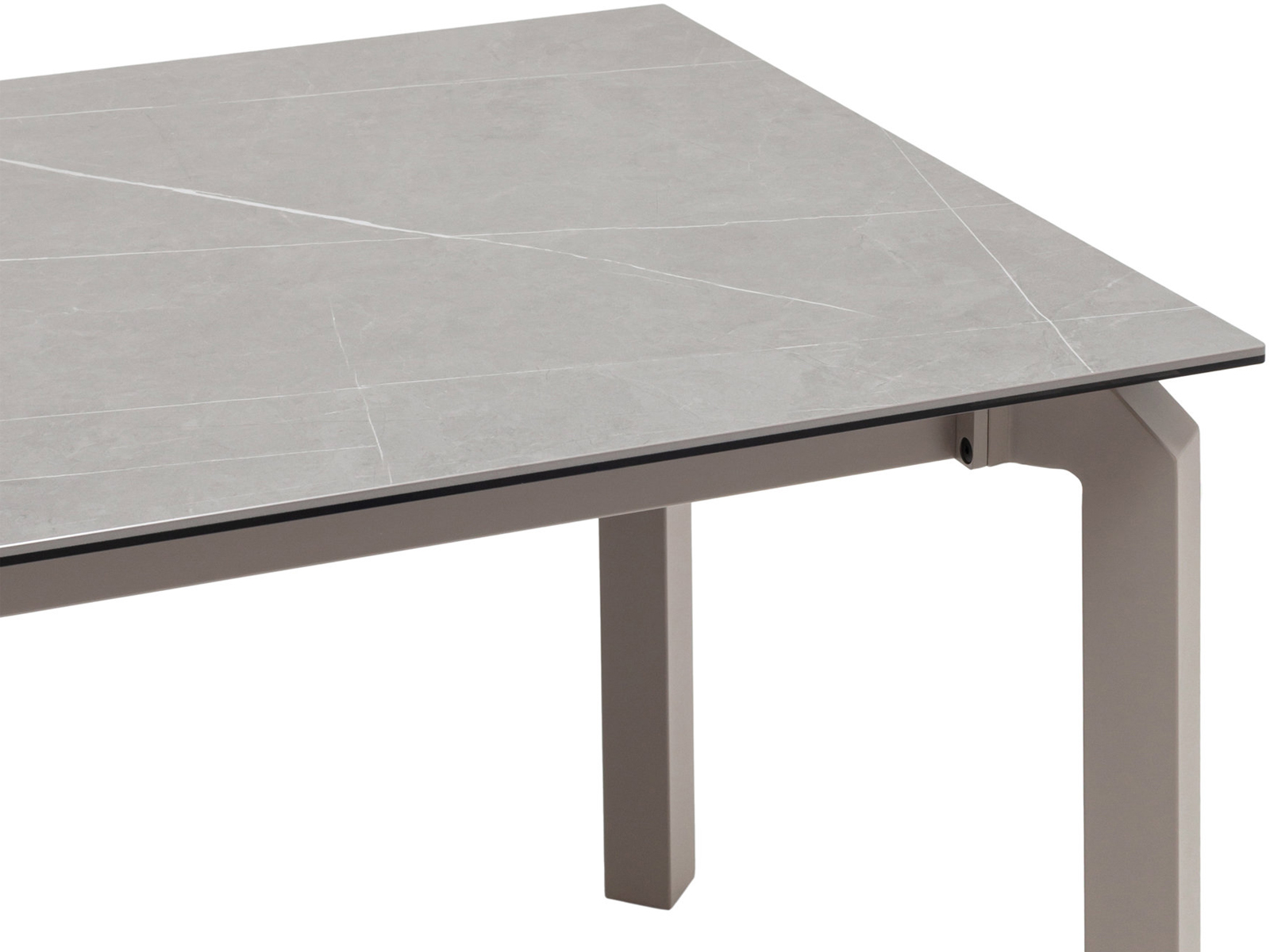 Столешница выполнена из прочной и износостойкой керамики серого цвета. Материал отличается устойчивостью к царапинам, влаге и высоким температурам, что делает стол идеальным для повседневного использования.