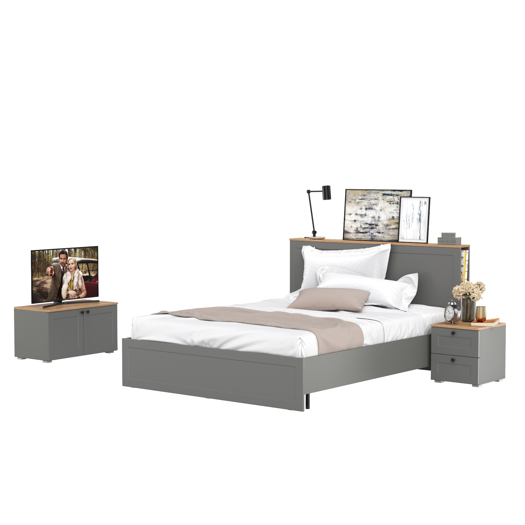 Кровать двуспальная с ортопедическим основанием Остин с прикроватной тумбочкой и тумбой 13.257. Комплектация состоит из двуспальной кровати Остин 11.53 с ортопедическим основанием, тумбы прикроватной Остин 16.152 и низкой тумбы Остин 13.257.