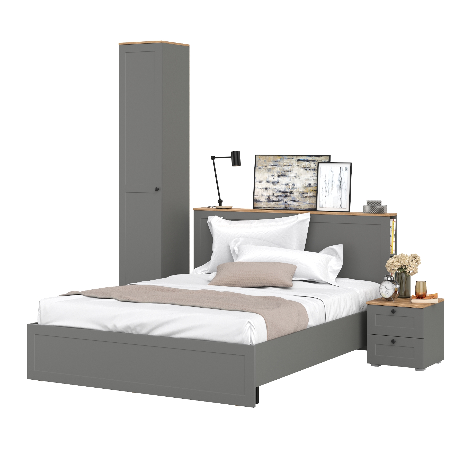 Кровать со спальным местом 1600 с ортопедическим основанием Остин с тумбой прикроватной и шкаф-пенал. Комплектация состоит из двуспальной кровати Остин 11.53 с ортопедическим основанием, тумбы прикроватной Остин 16.152 и пенала с полками Остин 13.227.