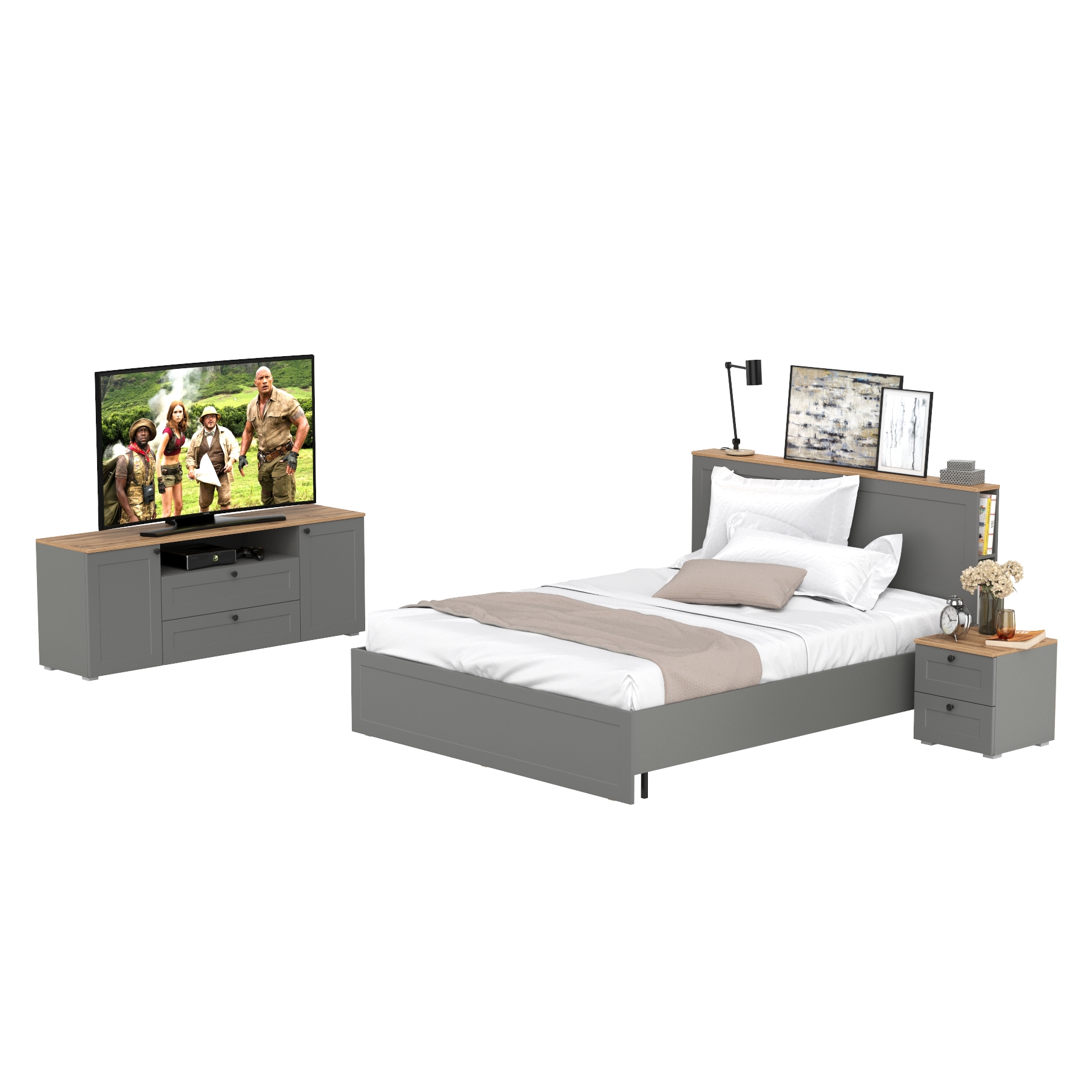 Остин набор мебели в спальню из кровати с основанием с ТВ-тумбой и прикроватной тумбой. Комплектация состоит из двуспальной кровати Остин 11.53 с ортопедическим основанием, тумбы прикроватной Остин 16.152 и тумбы под ТВ Остин 16.47.