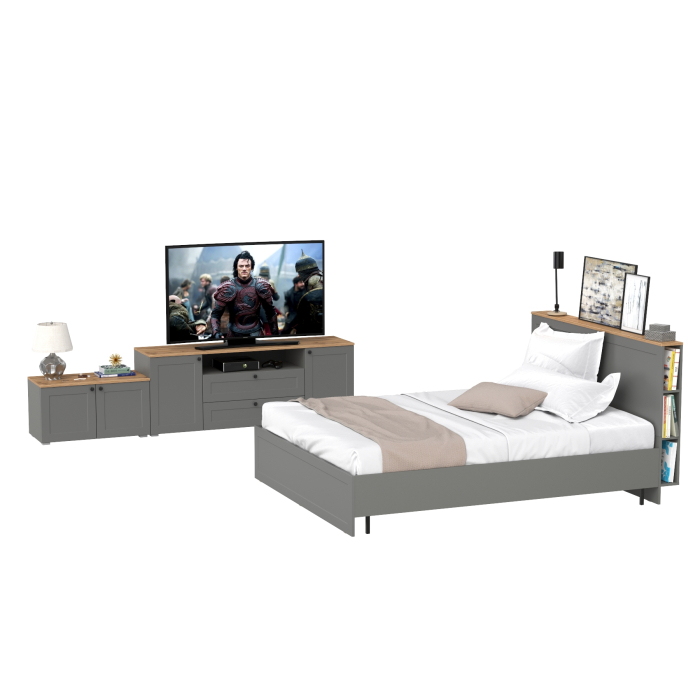 Спальный гарнитур Остин из кровати 1600 с ортопедом с тумбой для ТВ и тумбой с дверками. Комплектация состоит из двуспальной кровати Остин 11.53 с ортопедическим основанием, низкой тумбы Остин 13.257 и тумбы под ТВ Остин 16.47.