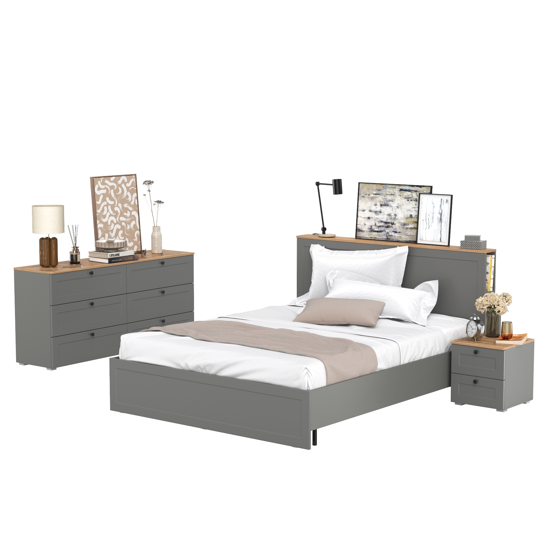 Комплектация состоит из двуспальной кровати Остин 11.53 с ортопедическим основанием, тумбы прикроватной Остин 16.152 и широкого комода Остин 16.240. Двуспальная кровать Остин 11.53 с ортопедическим основанием. Классическая двуспальная кровать со спальным местом 1600х2000 мм. В изголовье кровати встроены 3 полки-ниши с каждой стороны, предназначенные для хранения различных вещей. Ортопедическое основание с пятью ножками входят в комплект, матрас для данной кровати приобретаются отдельно. В металлический каркас основания вмонтированы деревянные планки особой формы - клеено-гнутые ламели. Эластичные ламели, изготовленные из однонаправленной фанеры, прогибаясь, выравнивают поверхностное давление, усиливая ортопедический эффект матраса. Тумба прикроватная Остин 16.152 с двумя выдвижными ящиками для хранения различных принадлежностей и мелких предметов. Скрытые направляющие с доводчиками выдвижных ящиков предназначены для обеспечения мягкого и плавного закрывания. Широкий комод Остин 16.240 оснащен шестью вместительными выдвижными ящиками на шариковых направляющих полного выдвижения. Размер каждого ящика — 726х336 мм, высота — 110 мм, полезная глубина — 33 см, что обеспечивает удобство хранения различных вещей.