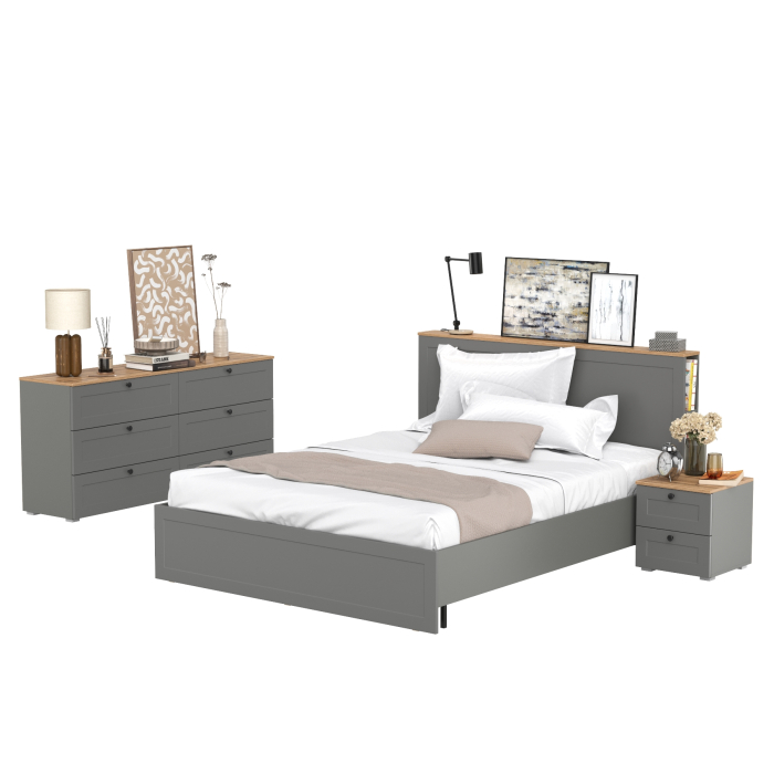 Гарнитур спальный Остин из комода 16.240 с кроватью с ортопедическим основанием и тумбы прикроватной – это воплощение современного классического стиля. Лаконичность, строгие линии, контрастная фурнитура, функциональность и элегантность – отличительные черты этой мебели.