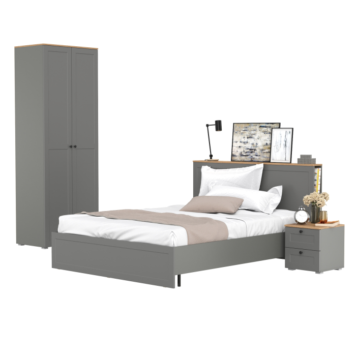 Двуспальная кровать Остин с ортопедическим основанием с платяным шкафом 13.224 и тумбой прикроватной. Комплектация состоит из двуспальной кровати Остин 11.53 с ортопедическим основанием, тумбы прикроватной Остин 16.152 и шкафа со штангой Остин 13.224.