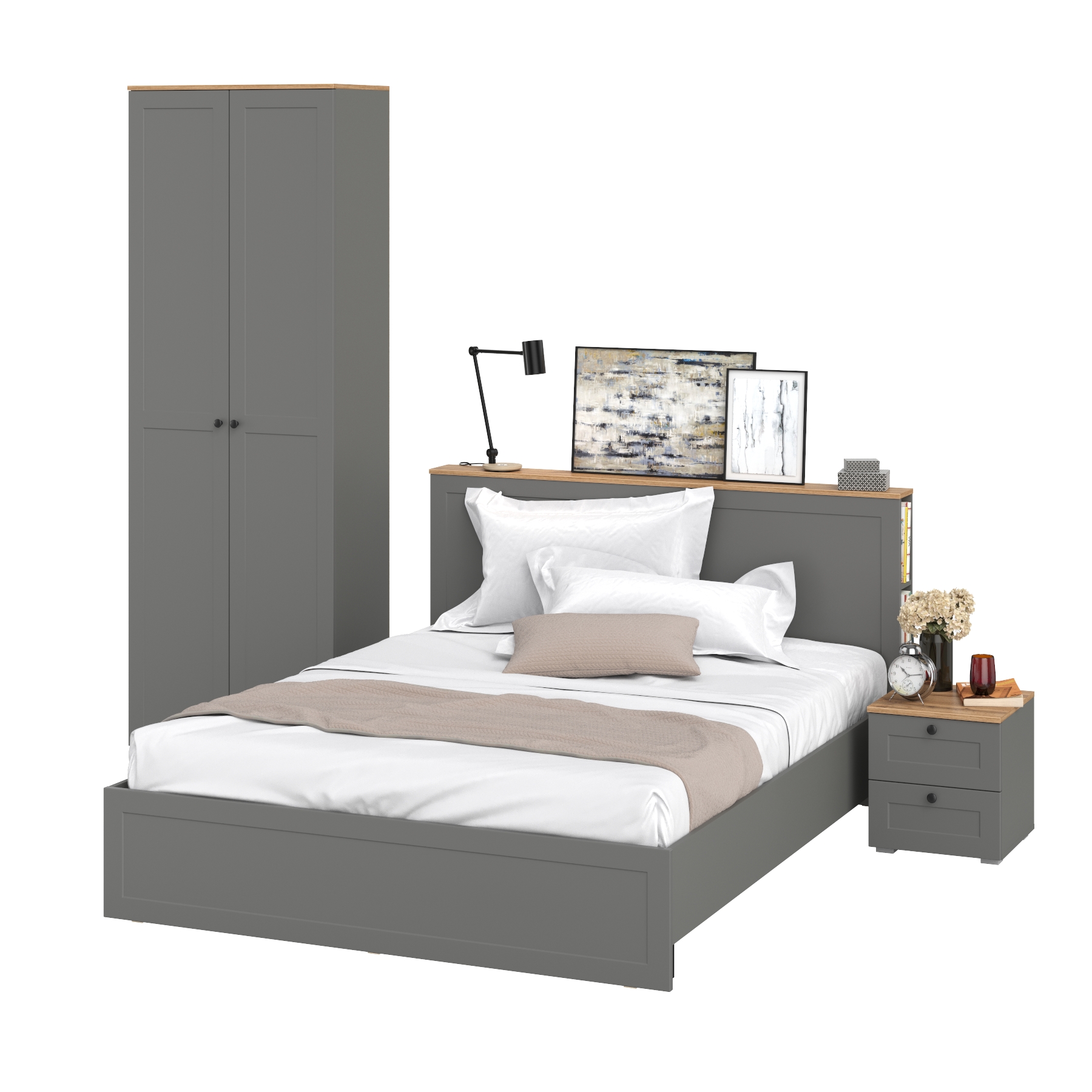Двухспальная кровать Остин с ортопедическим основанием и шкаф с полками 16.307 с тумбочкой прикроватной. Комплектация состоит из двуспальной кровати Остин 11.53 с ортопедическим основанием, тумбы прикроватной Остин 16.152 и шкафа с полками Остин 16.307.