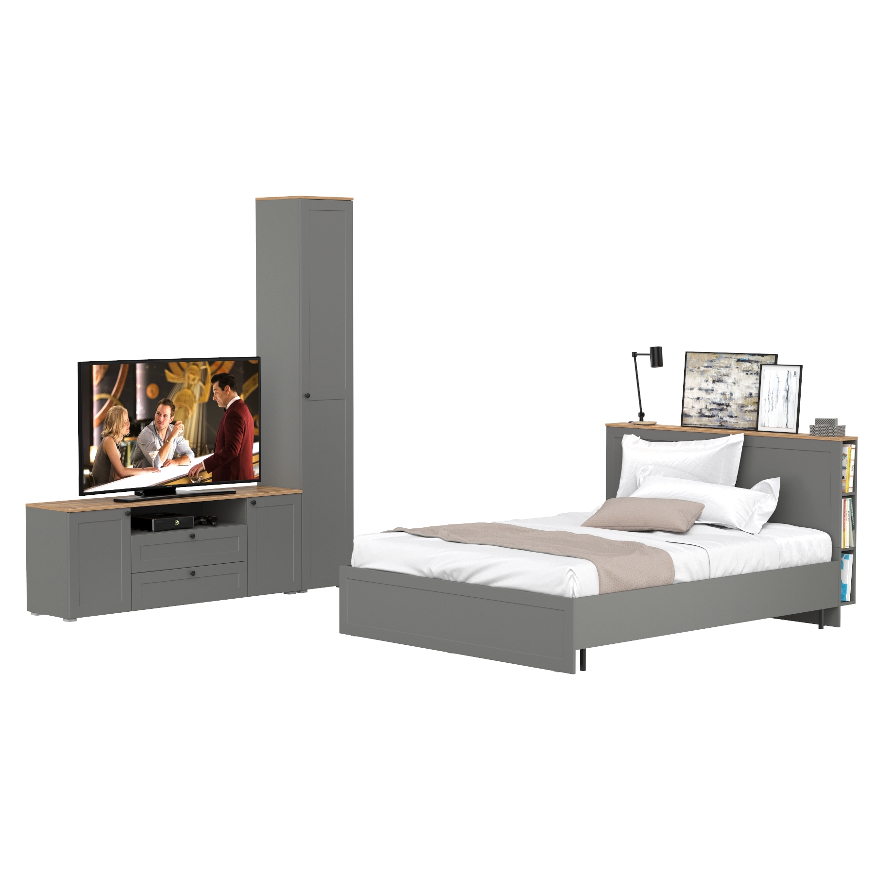 Кровать Остин со спальным местом 1600х2000 с ортопедическим основанием с пеналом с полками и тумба под ТВ (Крафт золотой/Серый) Код I0000449825
