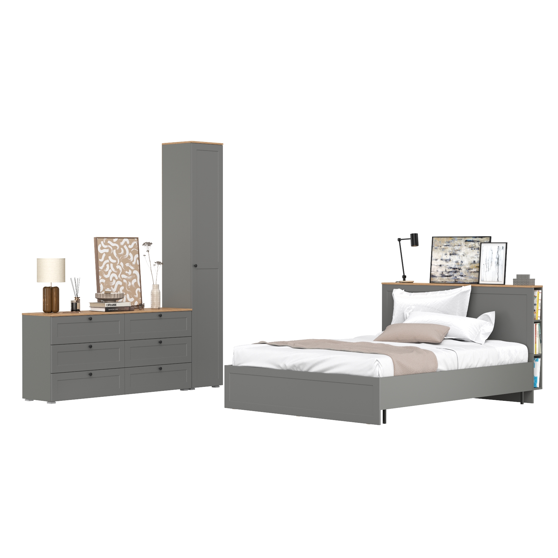 Комод шесть ящиков Остин с кроватью 1600 с основанием и пеналом с полками (Крафт золотой/Серый) Код I0000449829