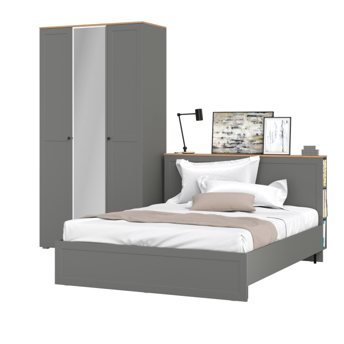 Шкаф для одежды с зеркалом Остин с кроватью Остин с ортопедическим основанием. Комплектация состоит из двуспальной кровати Остин 11.53 с ортопедическим основанием и шкафа с зеркалом Остин 13.336.03.