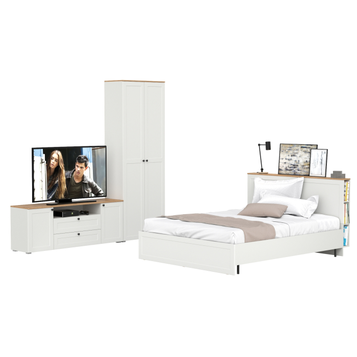 Остин кровать 1600 с ортопедическим основанием с тумбой для ТВ и шкафом с полками 16.307. Комплектация состоит из двуспальной кровати Остин 11.53 с ортопедическим основанием, тумбы под ТВ Остин 16.47 и шкафа с полками Остин 16.307.