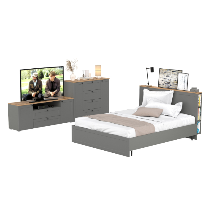 Отзывы о Столплит Кровать со спальным местом 1600 с ортопедическим основанием с тумбой под ТВ Остин 16.47 и комодом 16.221 Крафт золотой/Серый