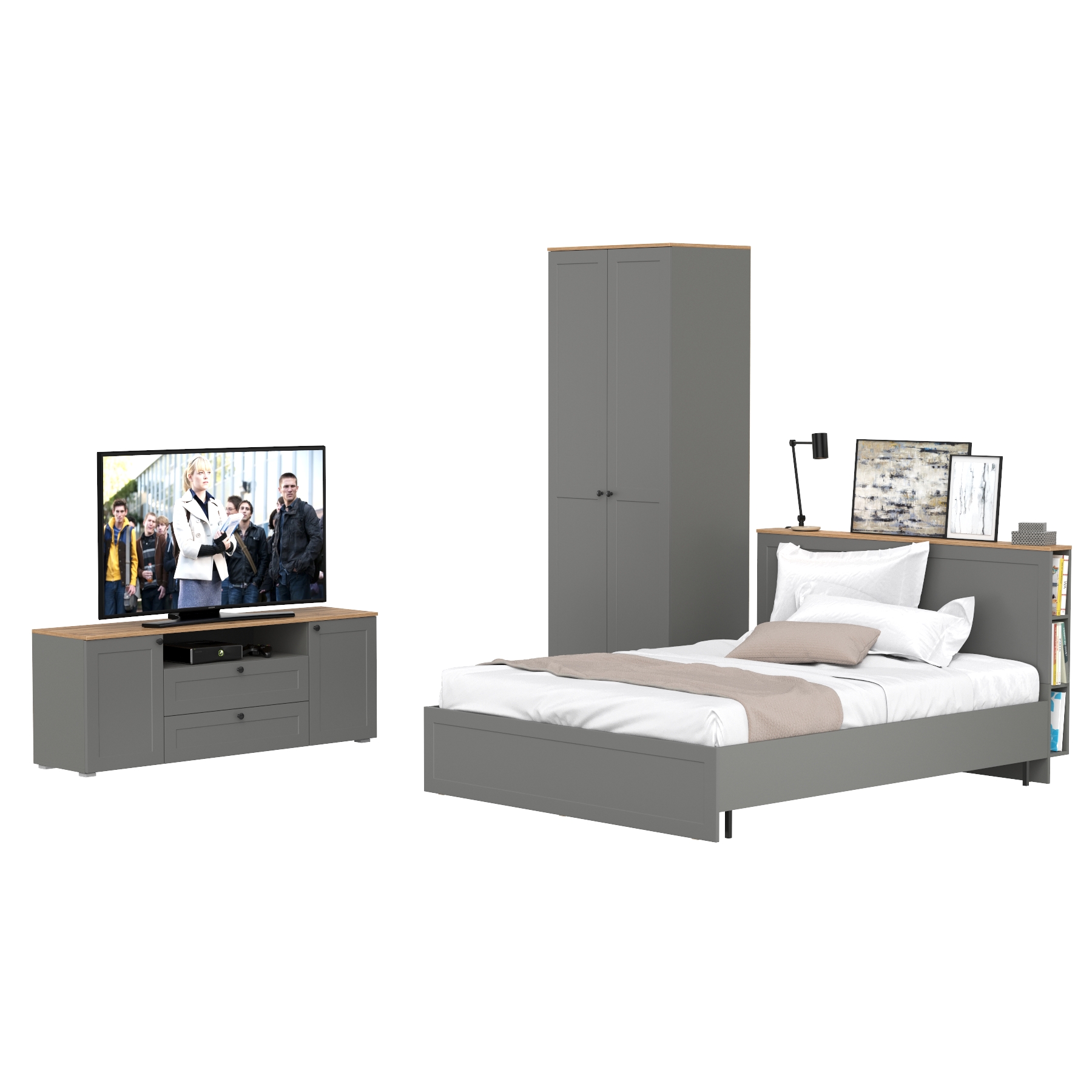 Отзывы о Столплит Мебель в спальню Остин из тумбы под ТВ с кроватью с ортопедом на 1600 и шкафа-комода для одежды 13.336.02 Крафт золотой/Серый