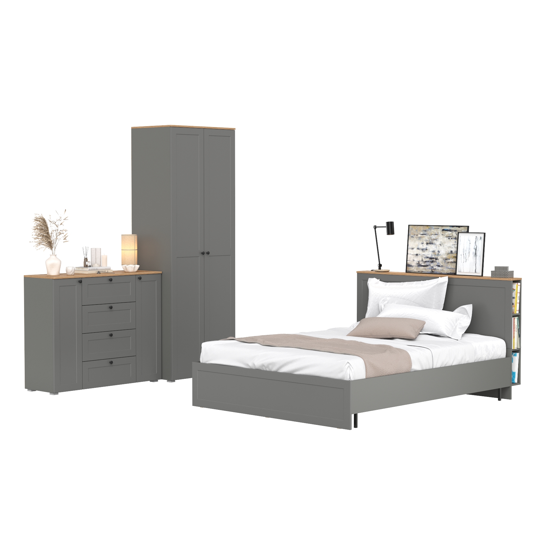 Выполнено в 2-х цветах: белый шагрень/дуб крафт золотой и серый графит/дуб крафт золотой.