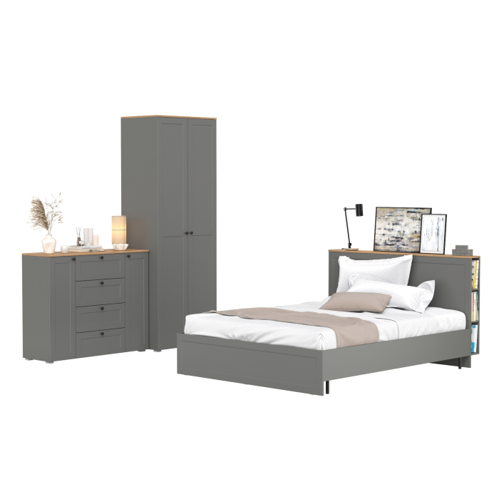 Остин мебель в спальню из бельевого шкафа 13.336.02 с кроватью 1600 с ортопедом и тумбы-комода 16.221. Комплектация состоит из двуспальной кровати Остин 11.53 с ортопедическим основанием, комода Остин 16.221 и шкафа с ящиками Остин 13.336.02.