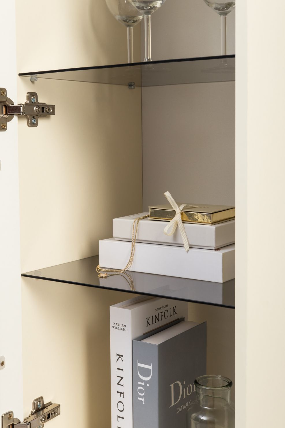 за которой стеклянные полки для хранения. Нижняя дверка глухая, за которой полочки из ЛДСП.