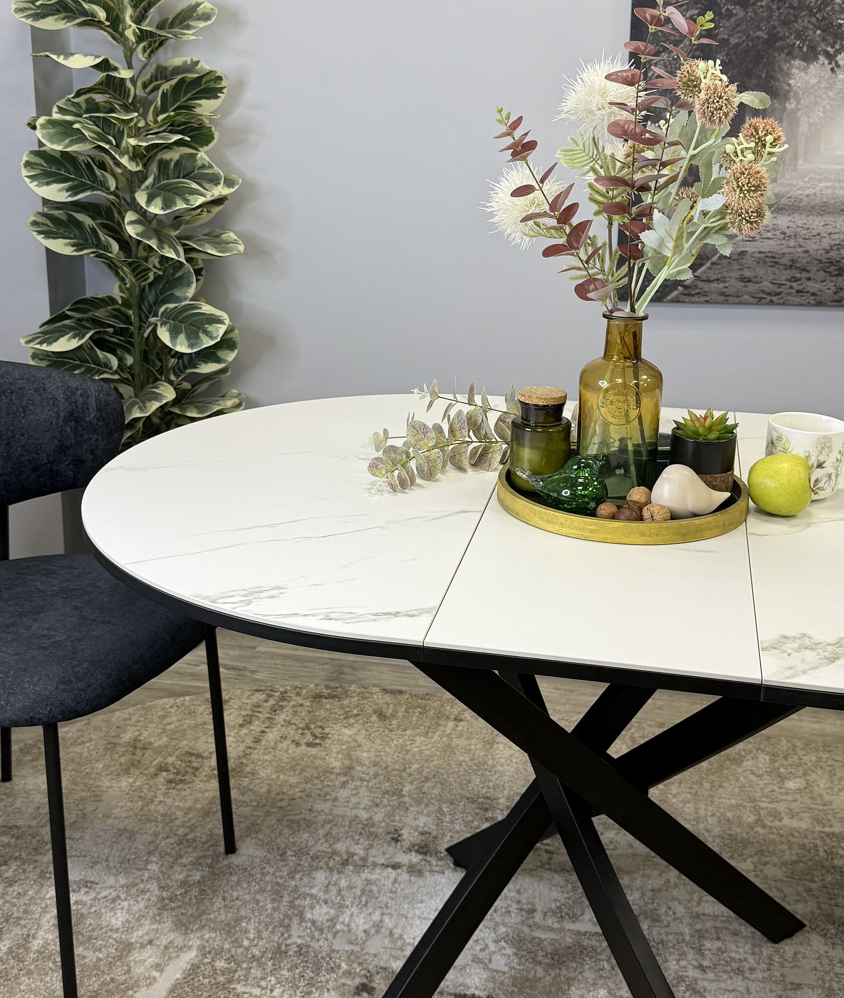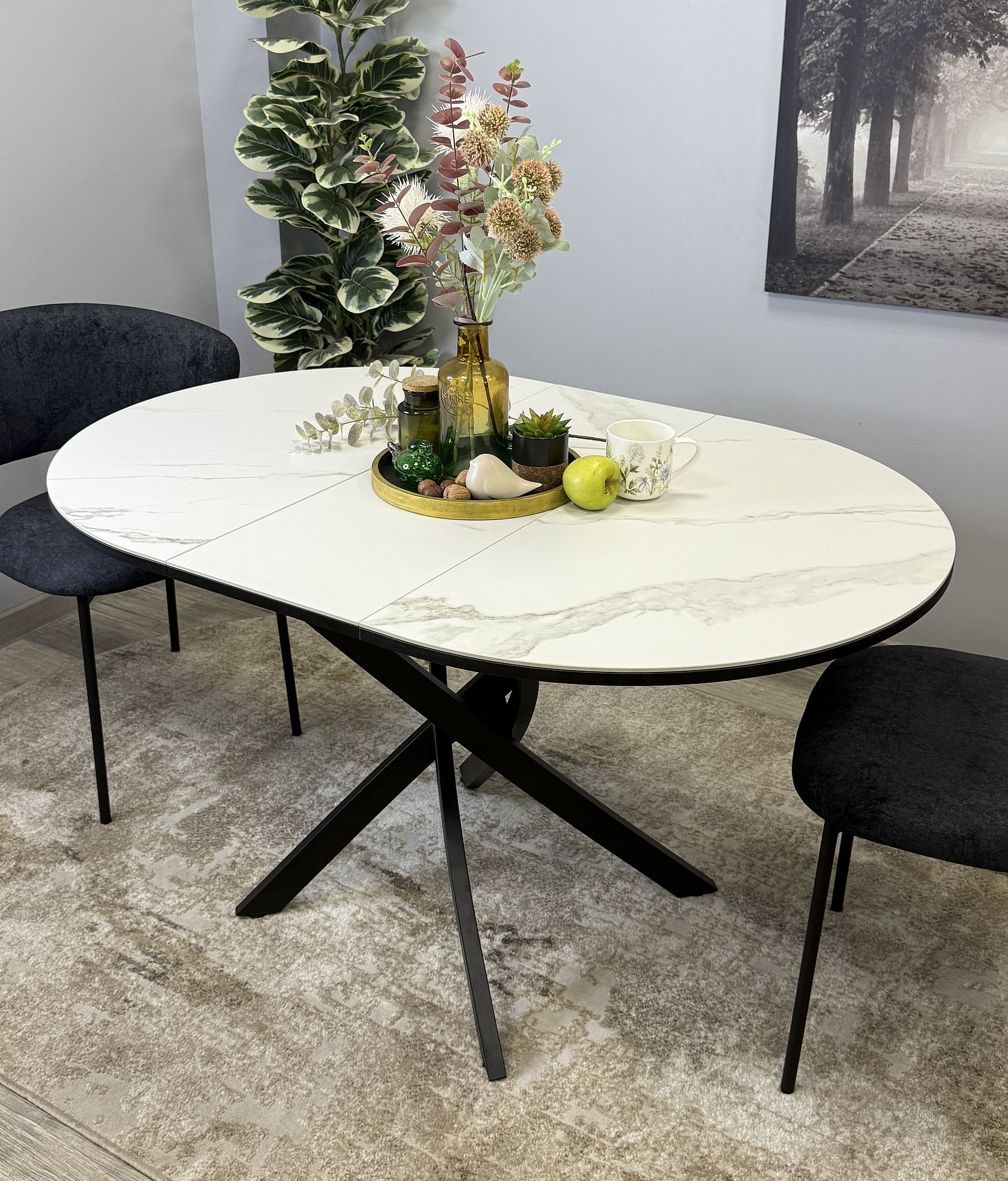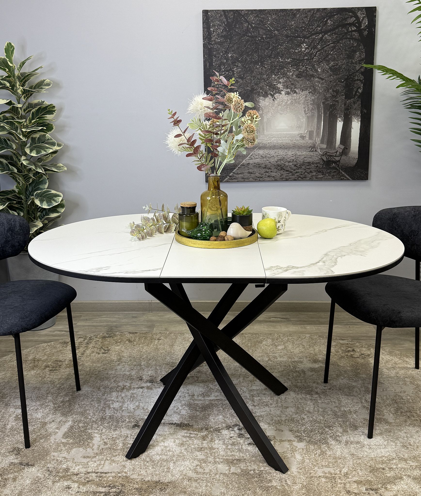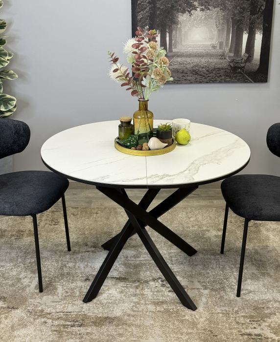 Ключевой особенностью этого стола является керамическая поверхность диаметром 90 см и долговечным, стабильным основанием. Дополняет комплект вставка на 30 см, расширяющая площадь стола.