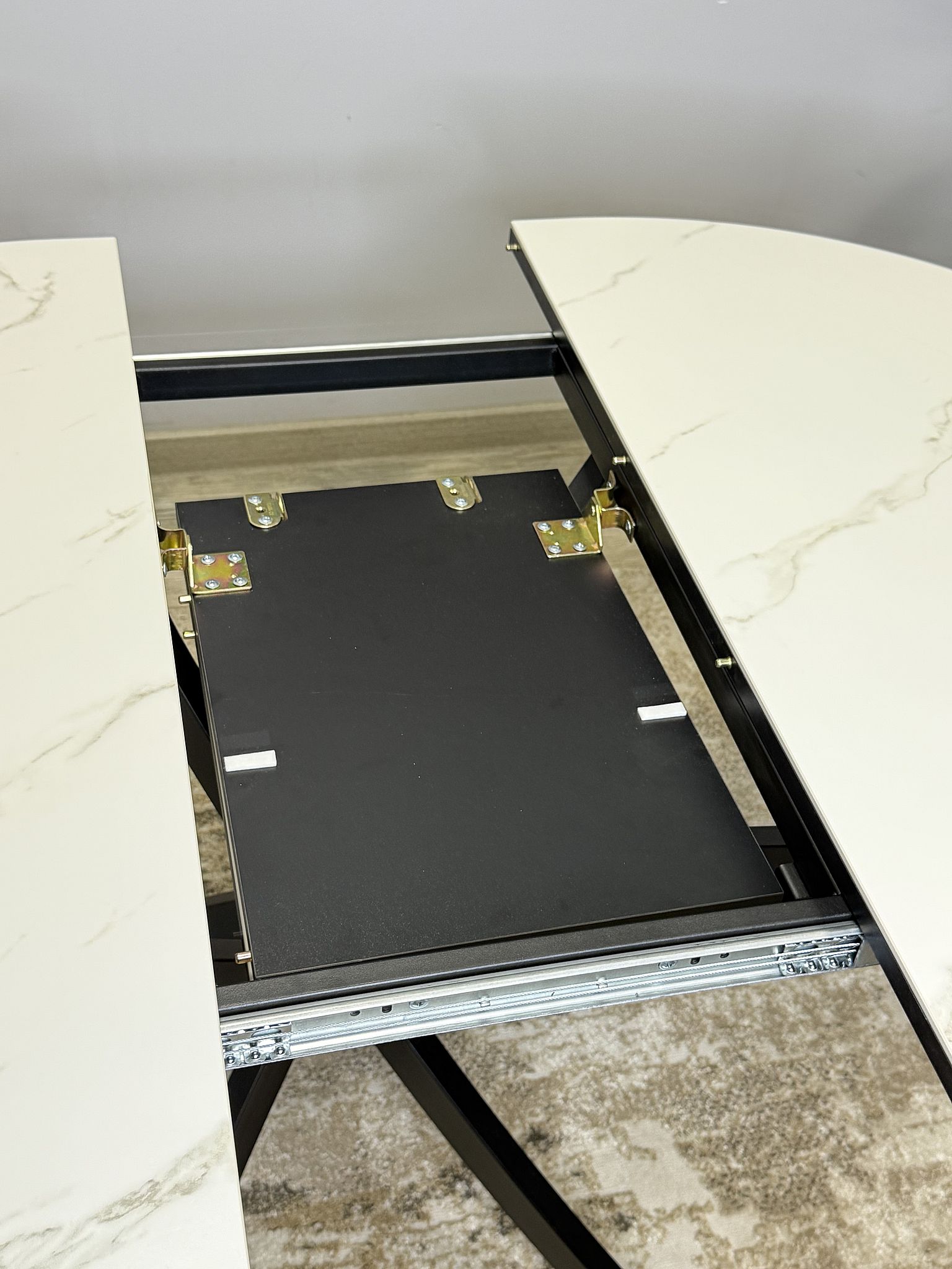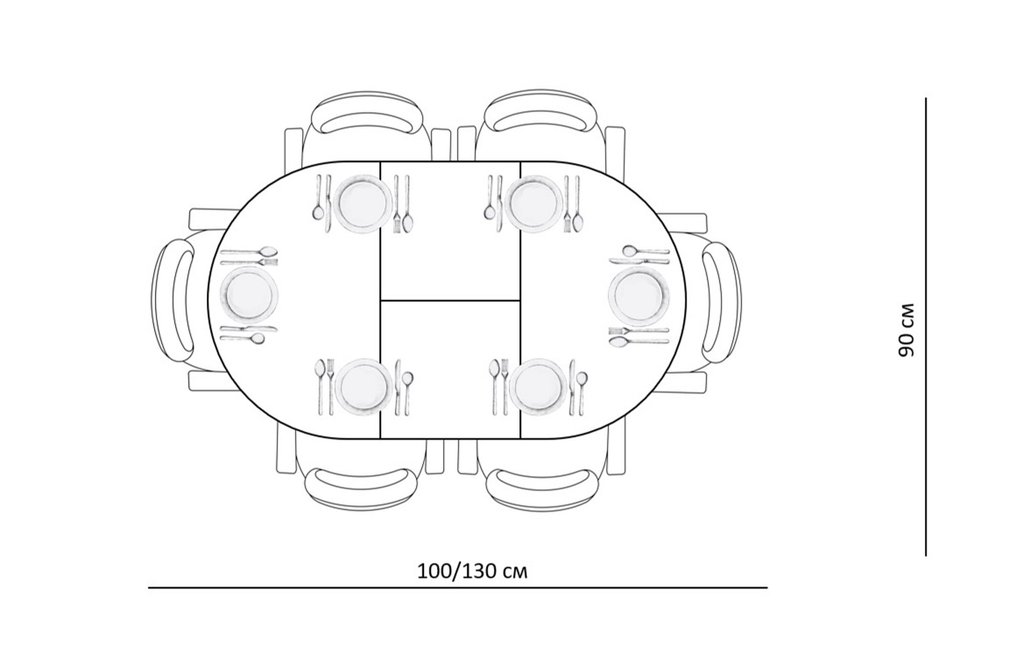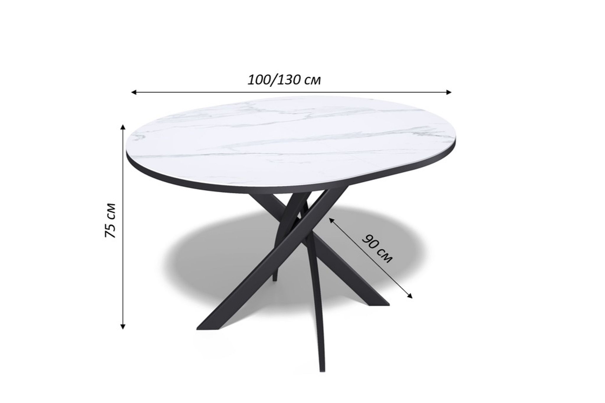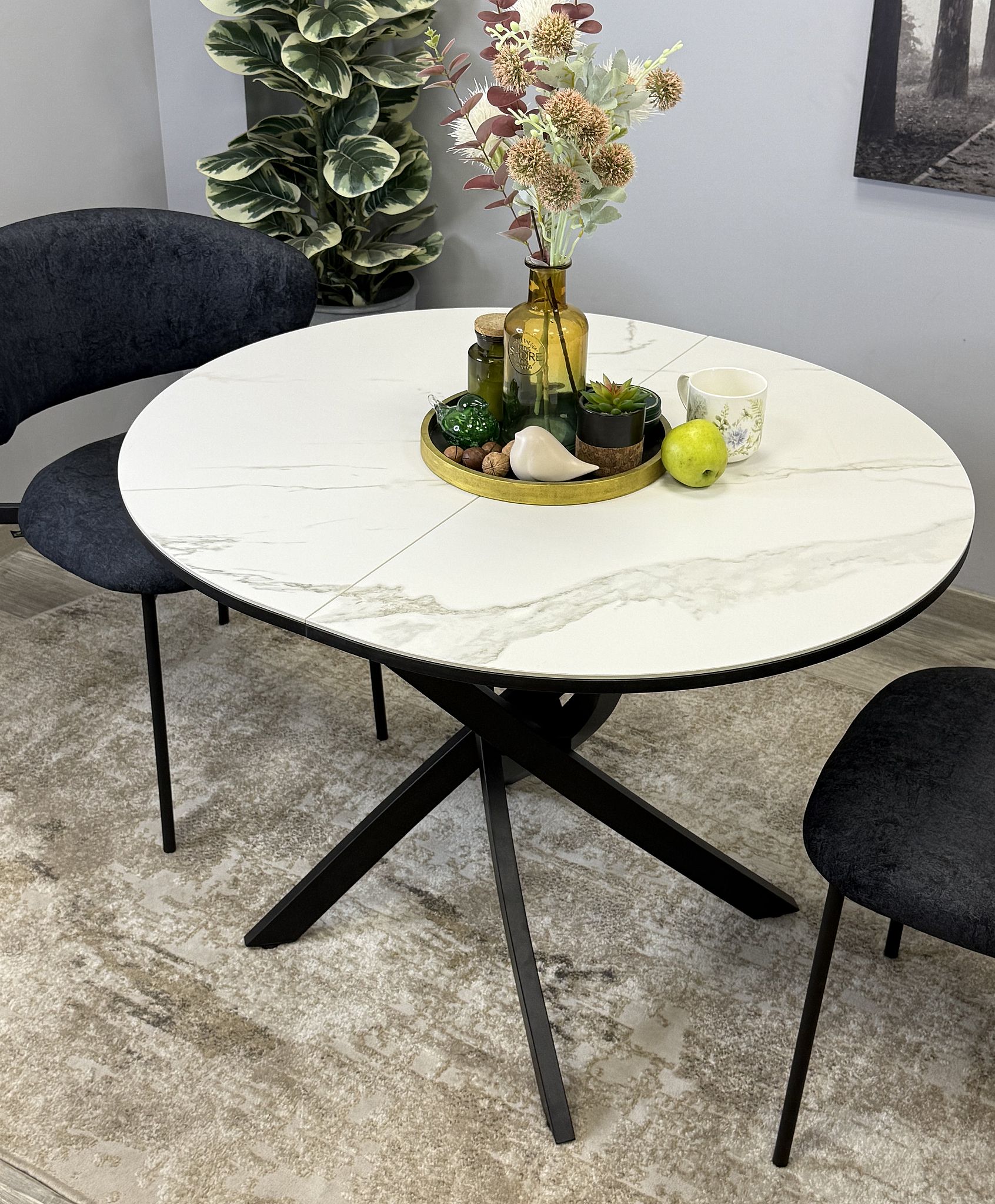 Ключевой особенностью этого стола является керамическая поверхность диаметром 90 см и долговечным, стабильным основанием. Дополняет комплект вставка на 30 см, расширяющая площадь стола.