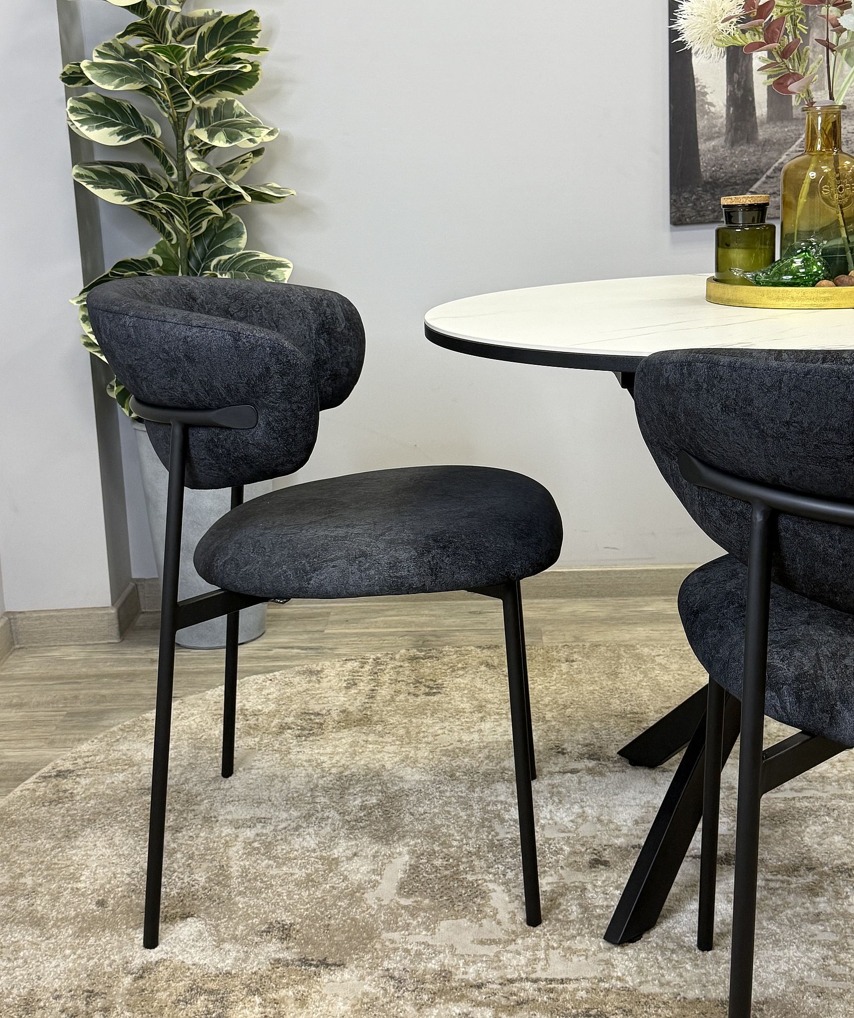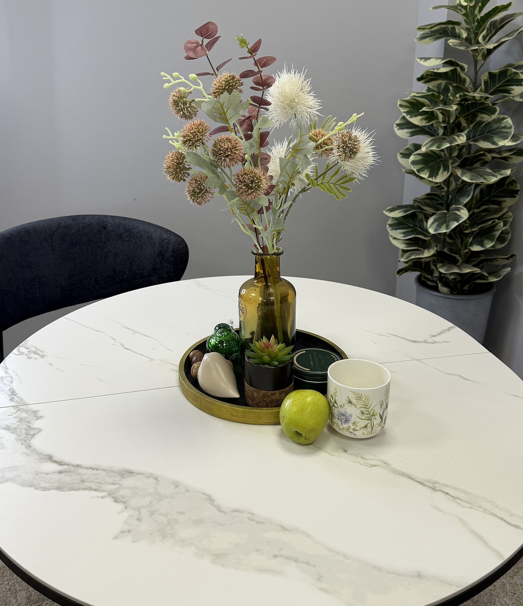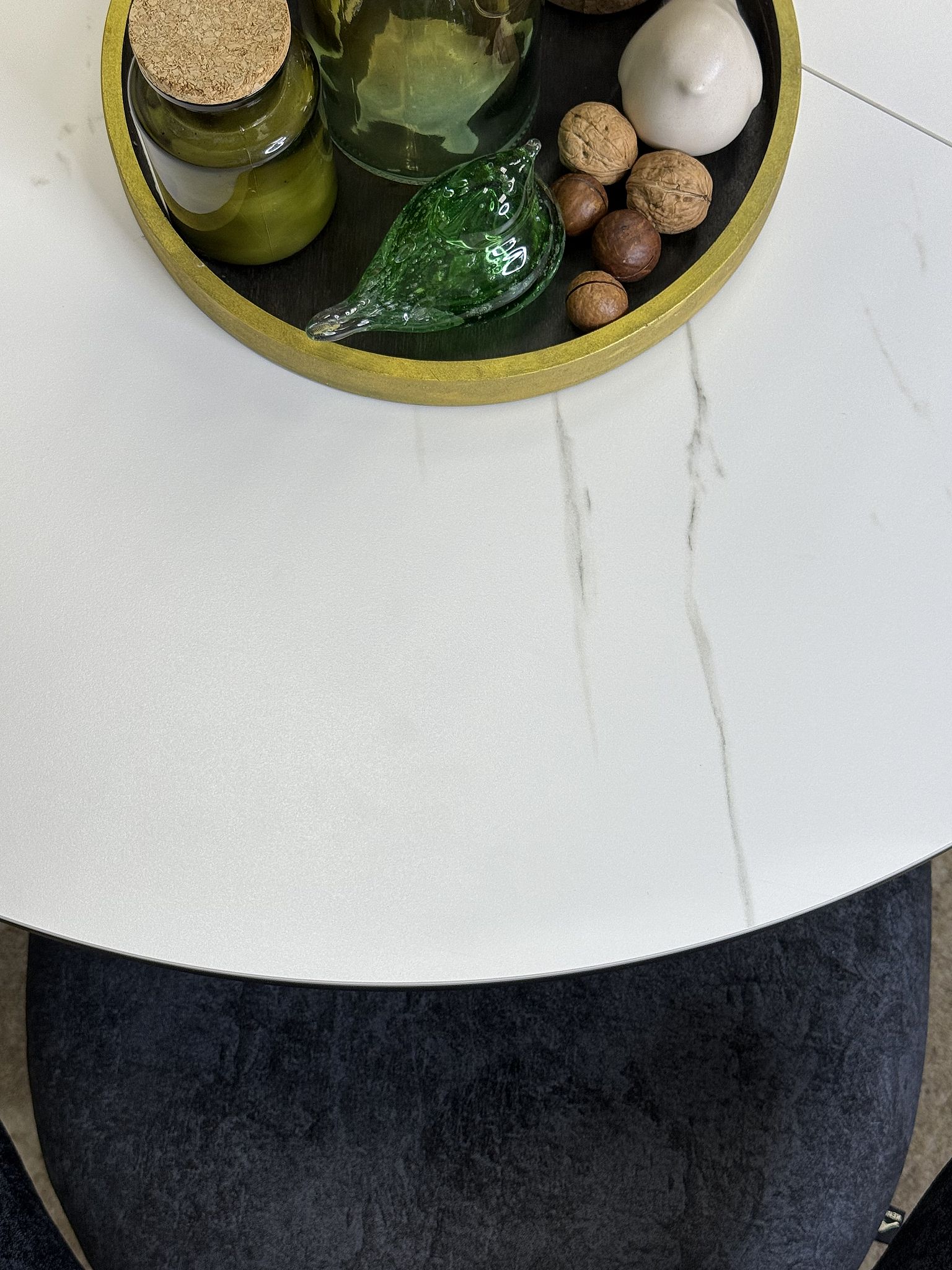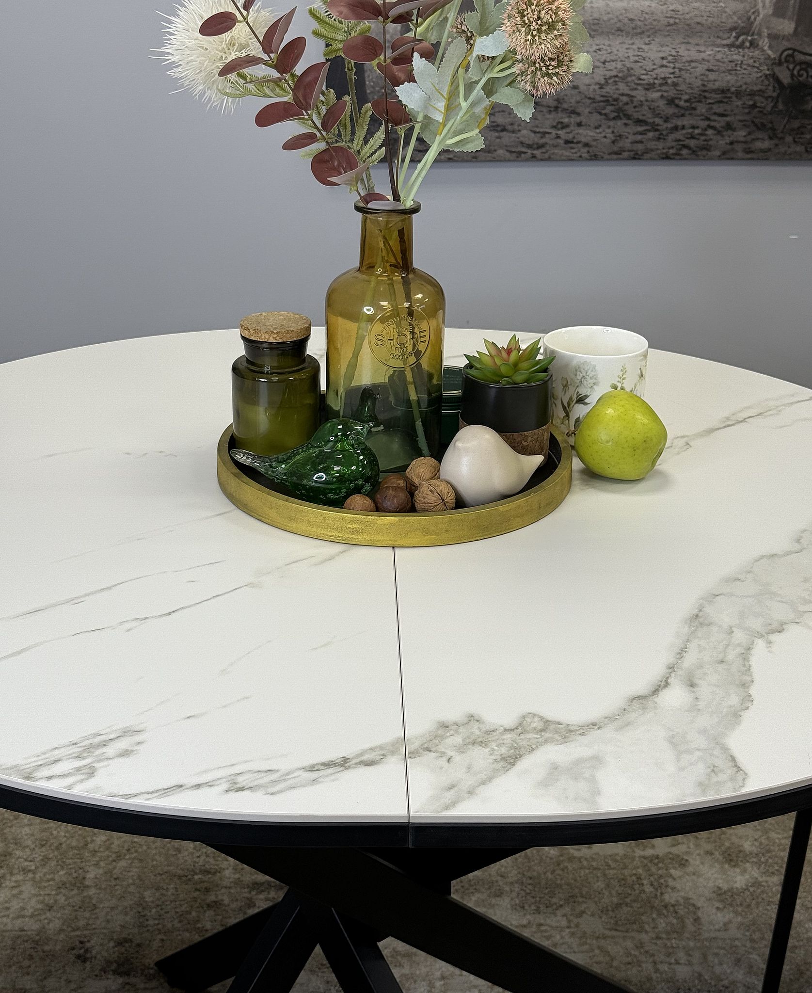 Ключевой особенностью этого стола является керамическая поверхность диаметром 90 см и долговечным, стабильным основанием. Дополняет комплект вставка на 30 см, расширяющая площадь стола.