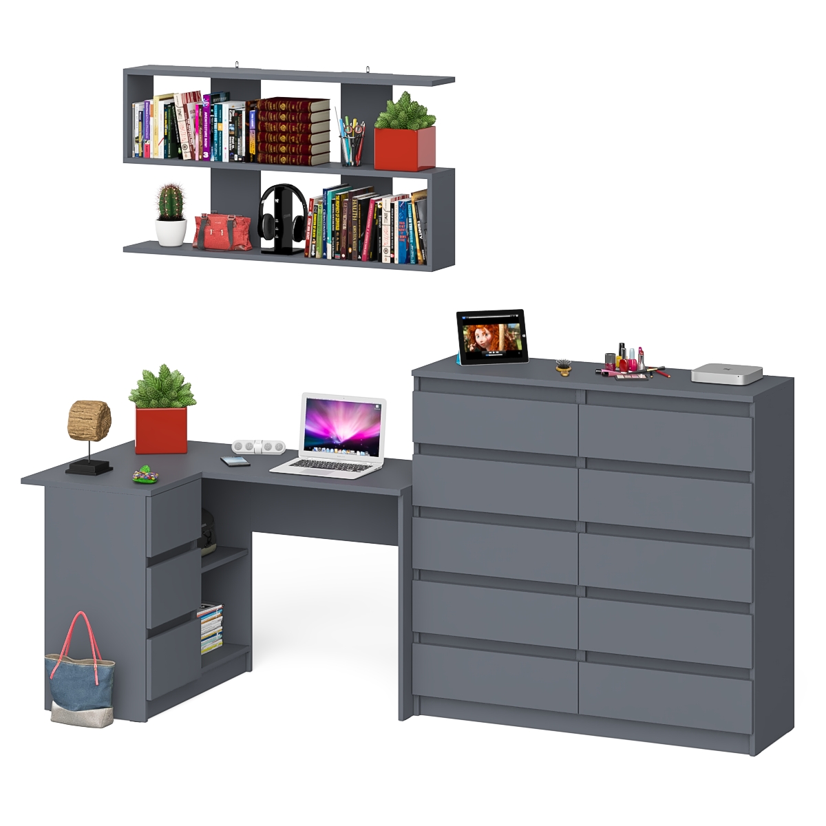 Комплектация включает угловой компьютерный стол Мори МС-16 левый, комод высокий на десять выдвижных ящиков Мори МК1200.10 и навесную полку Плк-1200. Отсутствие ручек главное преимущество данной модели. Роль ручек выполняют сами фасады.