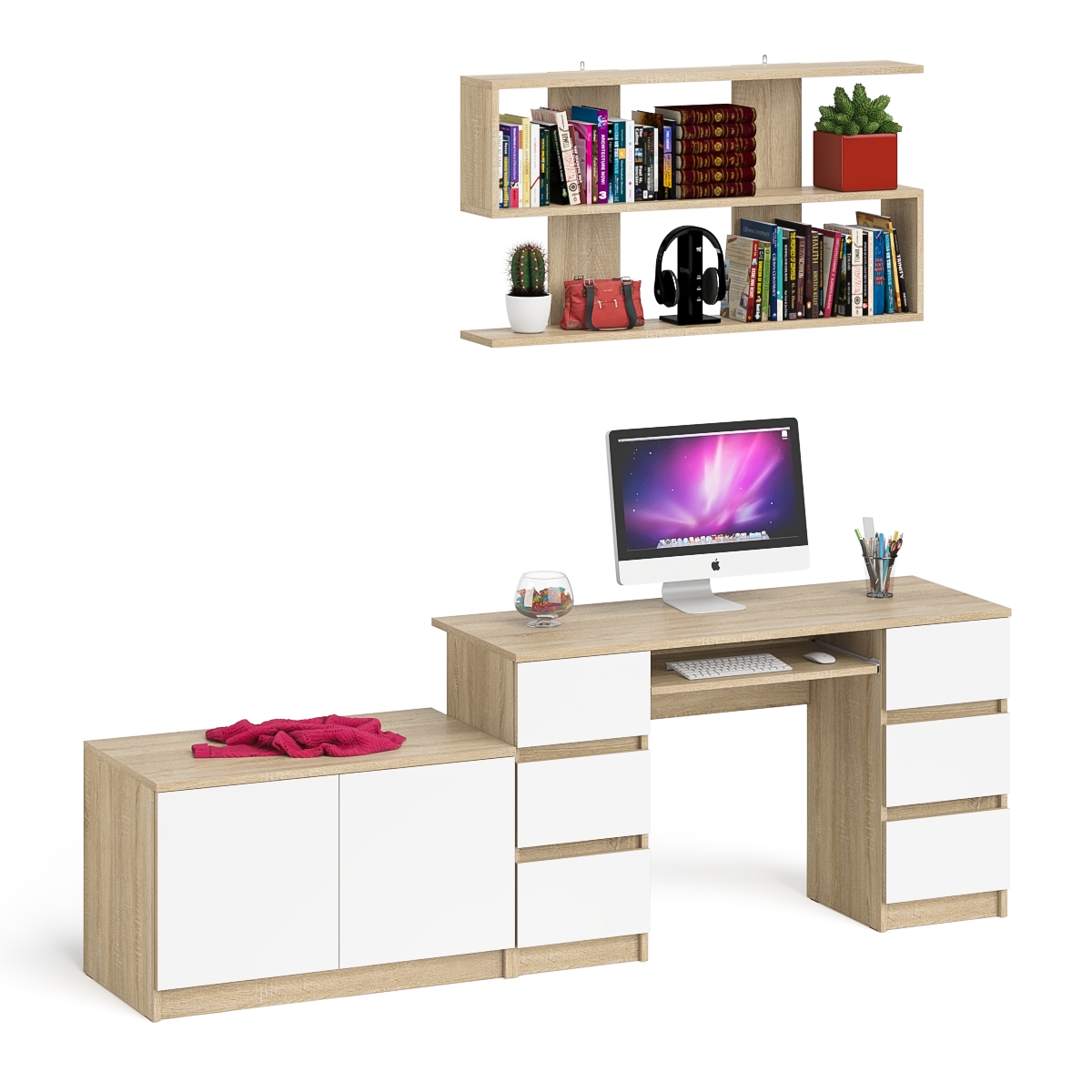 Стол компьютерный Мори МС-2 с верхней полкой и тумбой МА900.1 (Дуб Сонома, Белый) Код I0000450488