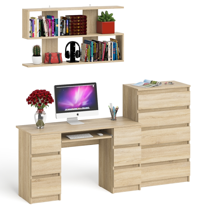 Выдвижные ящики на роликовых направляющих L=350 мм. неполного выдвижения обеспечивают комфортную эксплуатацию. На нижних кромках опор предусмотрены пластиковые подпятники. Мебель изготовлена из ламинированной ДСП 16 мм - прочного, устойчивого материала с длительным сроком службы, торцы окромлены ПХВ плёнкой. Поставляется в разобранном виде.