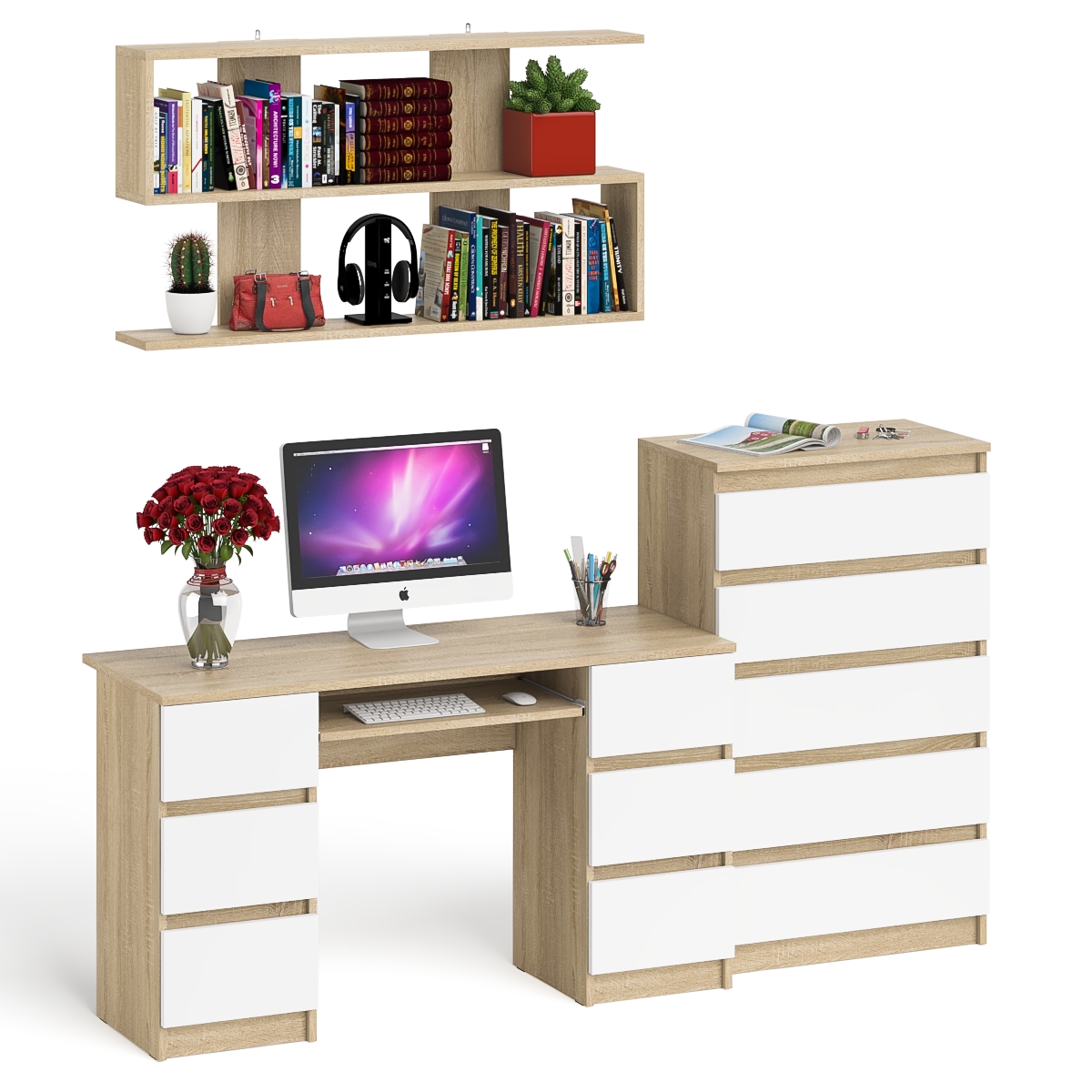Отзывы о Столплит Стол для работы МС-2 с высоким комодом на пять ящиков и навесной полкой Мори Дуб Сонома, Белый