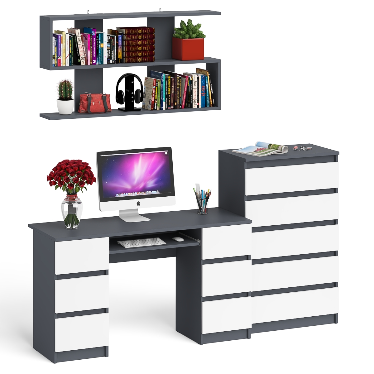 Стол для работы МС-2 с высоким комодом на пять ящиков и навесной полкой Мори (Графит/Белый) Код I0000450523