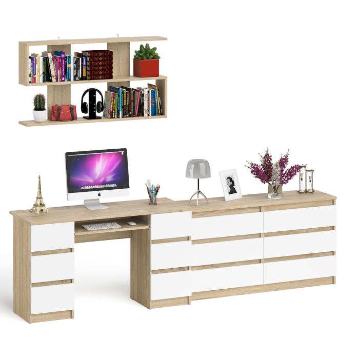 Стол компьютерный ящики слева и справа Мори МС-2 с комодом и полкой навесной (Дуб Сонома, Белый) Код I0000450541