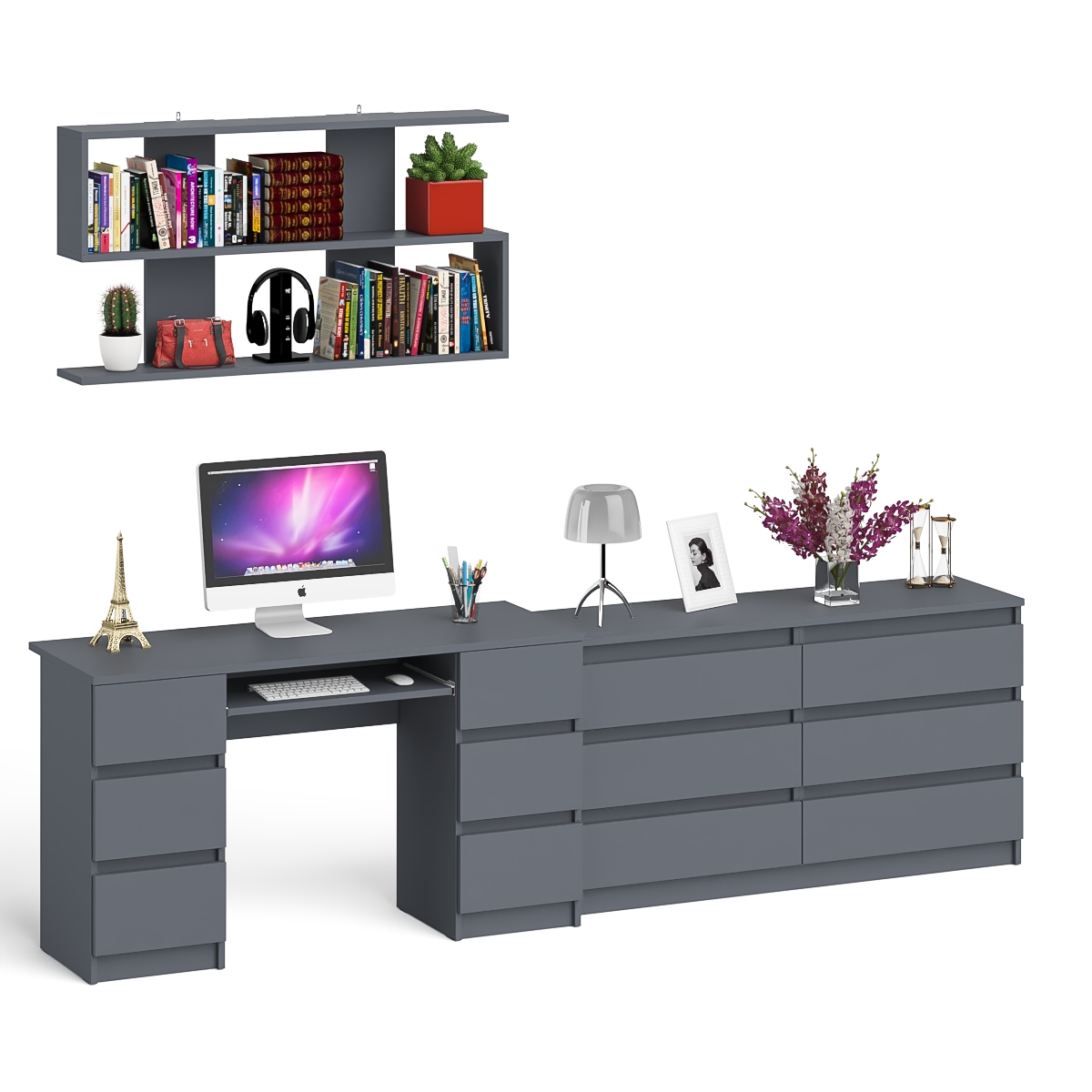 Стол компьютерный ящики слева и справа Мори МС-2 с комодом МК1380.6 и полкой навесной - минималистичный дизайн и доступная цена позволяет наслаждаться качественной и современной мебелью без значительных финансовых затрат! Комплектация включает компьютерный стол с двумя тумбами Мори МС-2, комод на шесть ящиков Мори МК1380.6 и навесную полку Плк-1200. Отсутствие ручек главное преимущество данной модели. Роль ручек выполняют сами фасады.