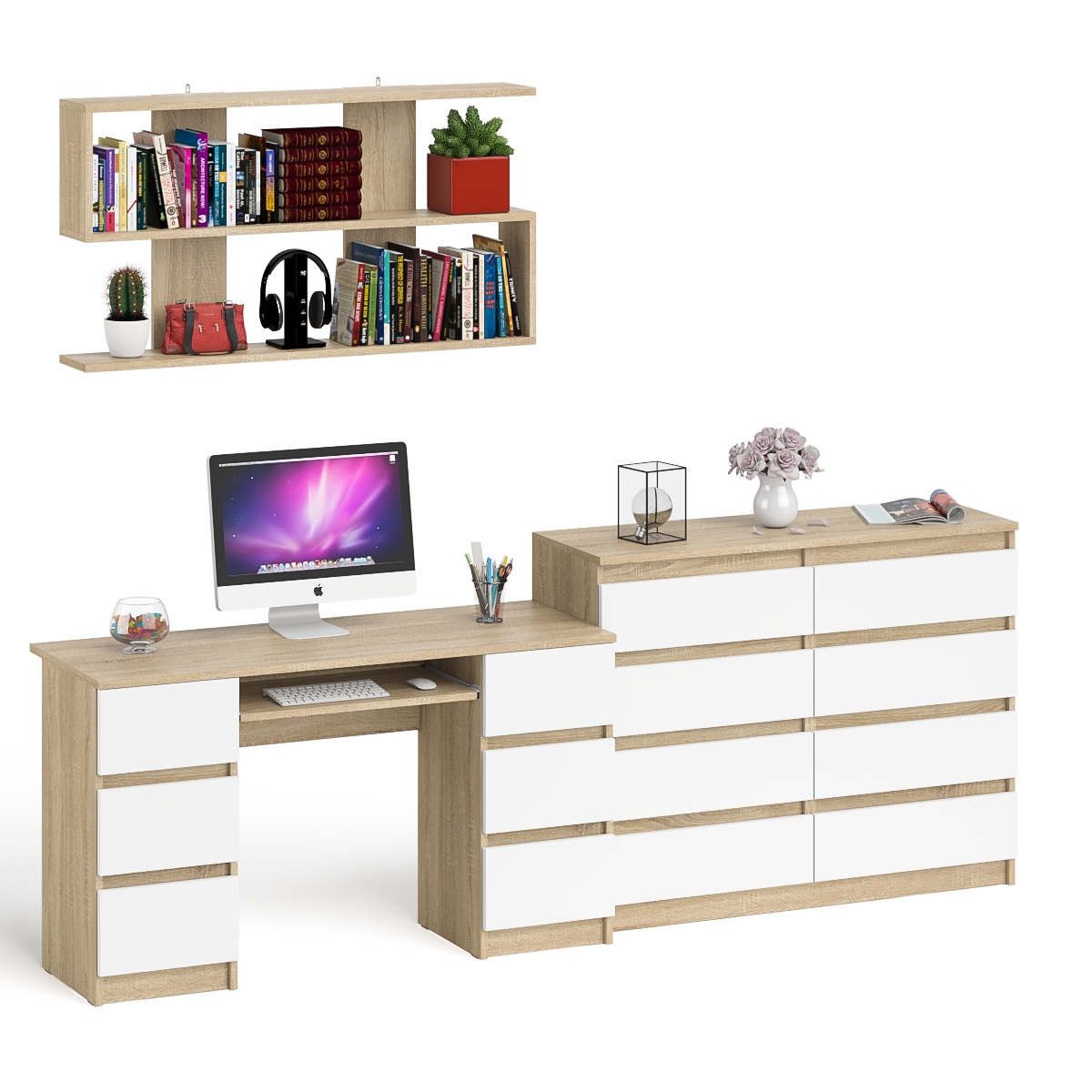 Полка Мори 1200 с письменным столом Мори МС-2 и комодом на восемь ящиков (Дуб Сонома, Белый) Код I0000450556