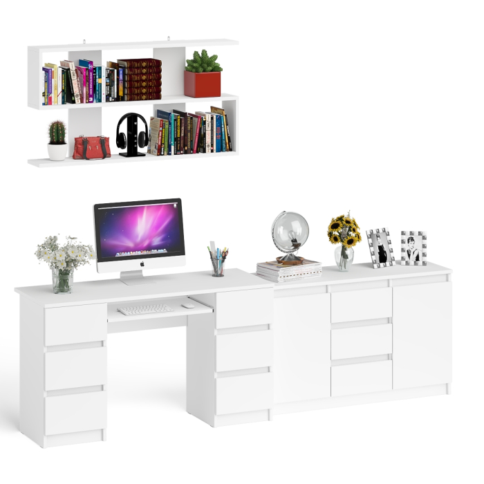 Компьютерный стол оборудован шестью ящиками и выдвижной полкой для клавиатуры. Под столешницей по бокам расположены две тумбы с тремя выдвижными ящиками в каждой.