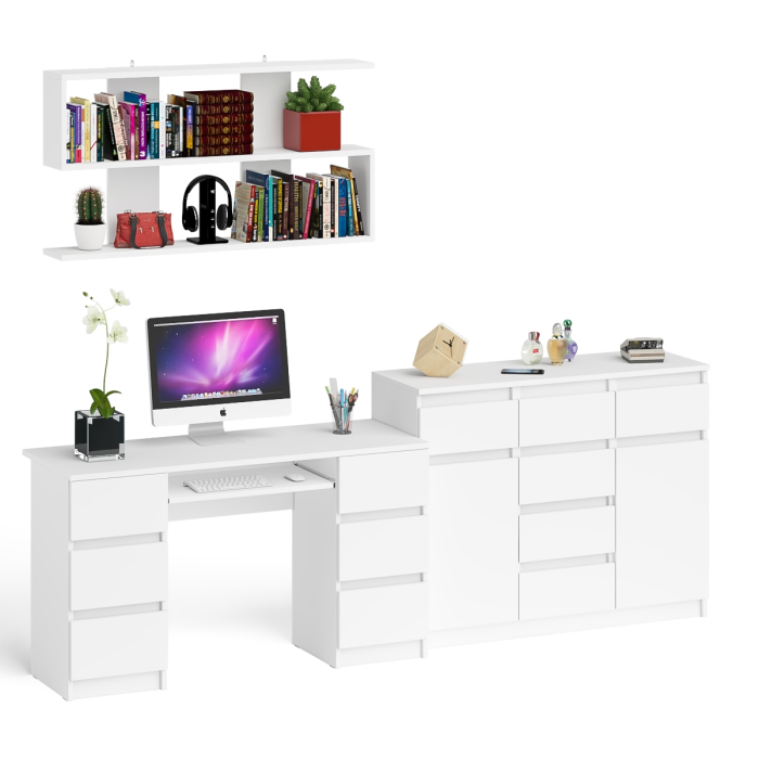 Комод-тумба Мори МК1200.4 с открытой верхней полкой и стол компьютерный МС-2 - минималистичный дизайн и доступная цена позволяет наслаждаться качественной и современной мебелью без значительных финансовых затрат! Комплектация включает компьютерный стол с двумя тумбами Мори МС-2, комод с ящиками и дверками Мори МК1200.4 и навесную полку Плк-1200. Отсутствие ручек главное преимущество данной модели. Роль ручек выполняют сами фасады.