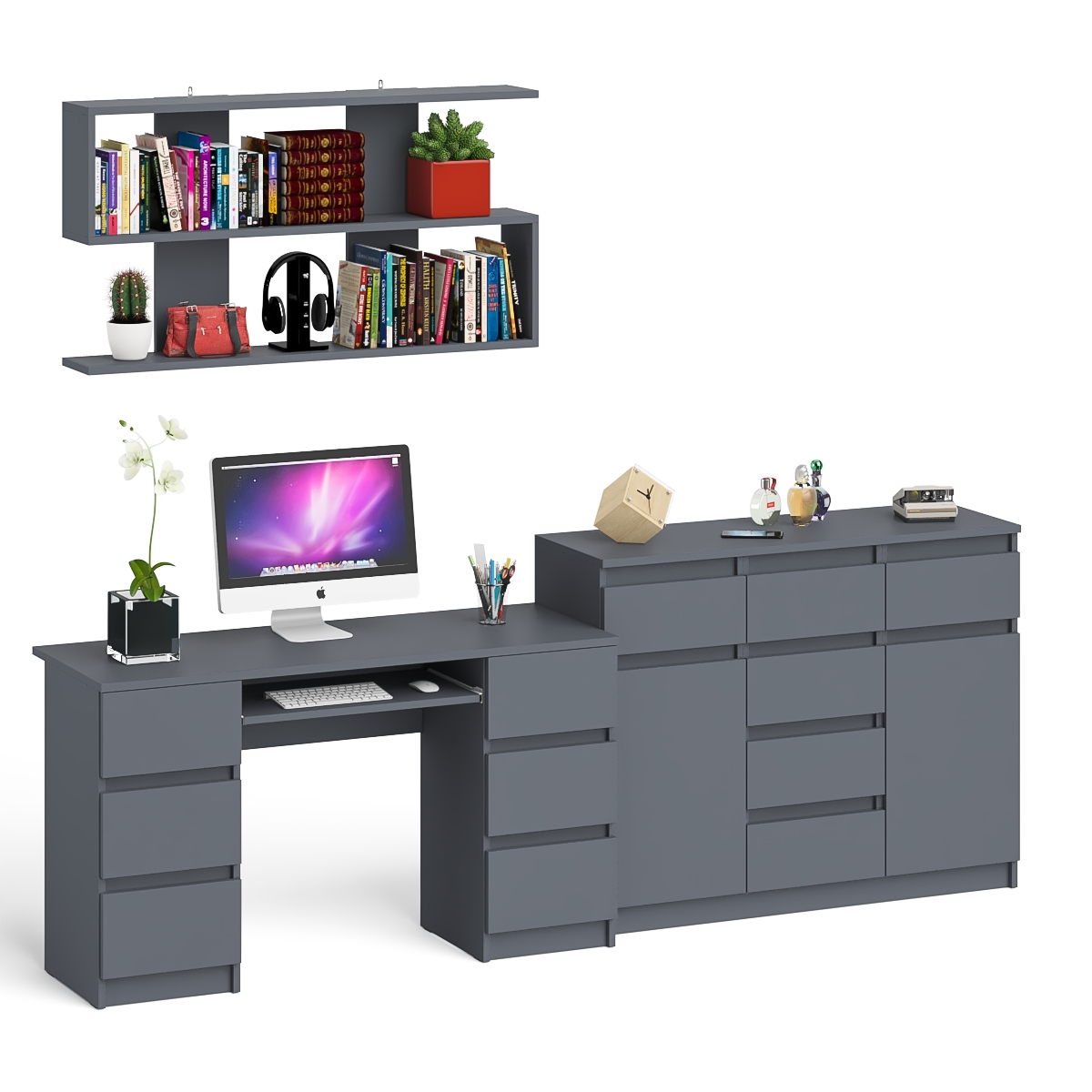 Компьютерный стол оборудован шестью ящиками и выдвижной полкой для клавиатуры. Под столешницей по бокам расположены две тумбы с тремя выдвижными ящиками в каждой.