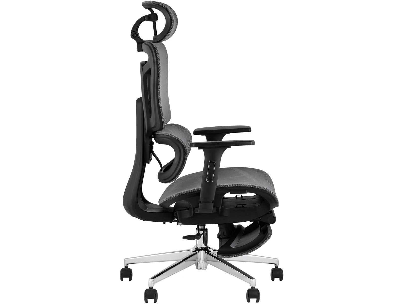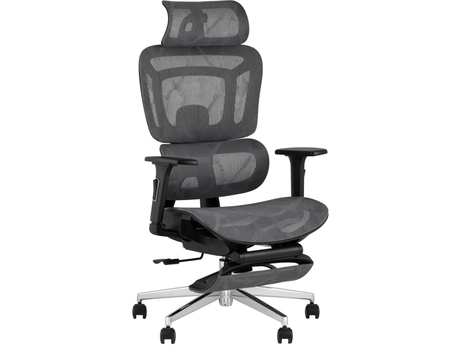 Кресло оснащено подголовником с возможностью регулировки, эргономичной высокой спинкой и 3D-подлокотниками — с изменением высоты, глубины и ширины. Благодаря синхромеханизму с мультиблоком можно зафиксировать удобное положение и обеспечить оптимальную поддержку спины. Газлифт 3 класса позволяет плавно регулировать высоту сиденья от 45 до 53 см. Встроенная выдвижная оттоманка обеспечивает дополнительный комфорт и позволяет удобно расположить ноги во время перерыва. Максимальная нагрузка — 120 кг.