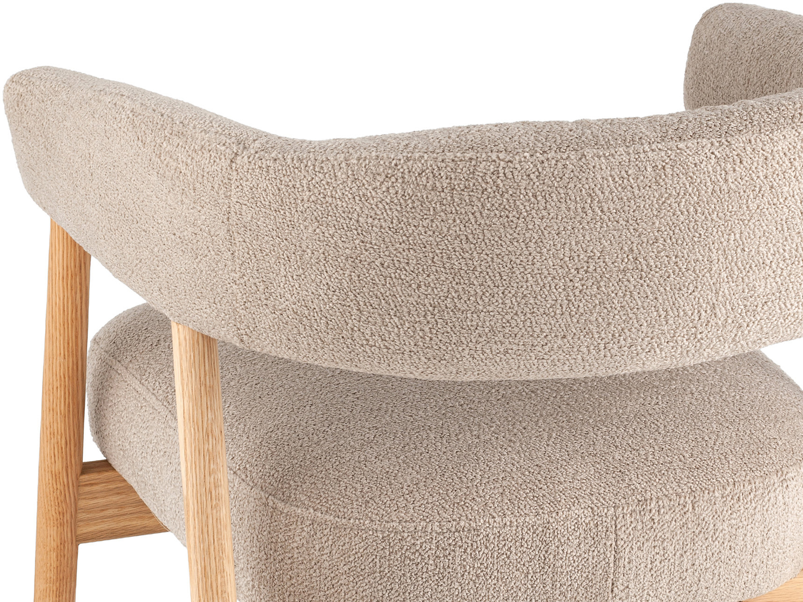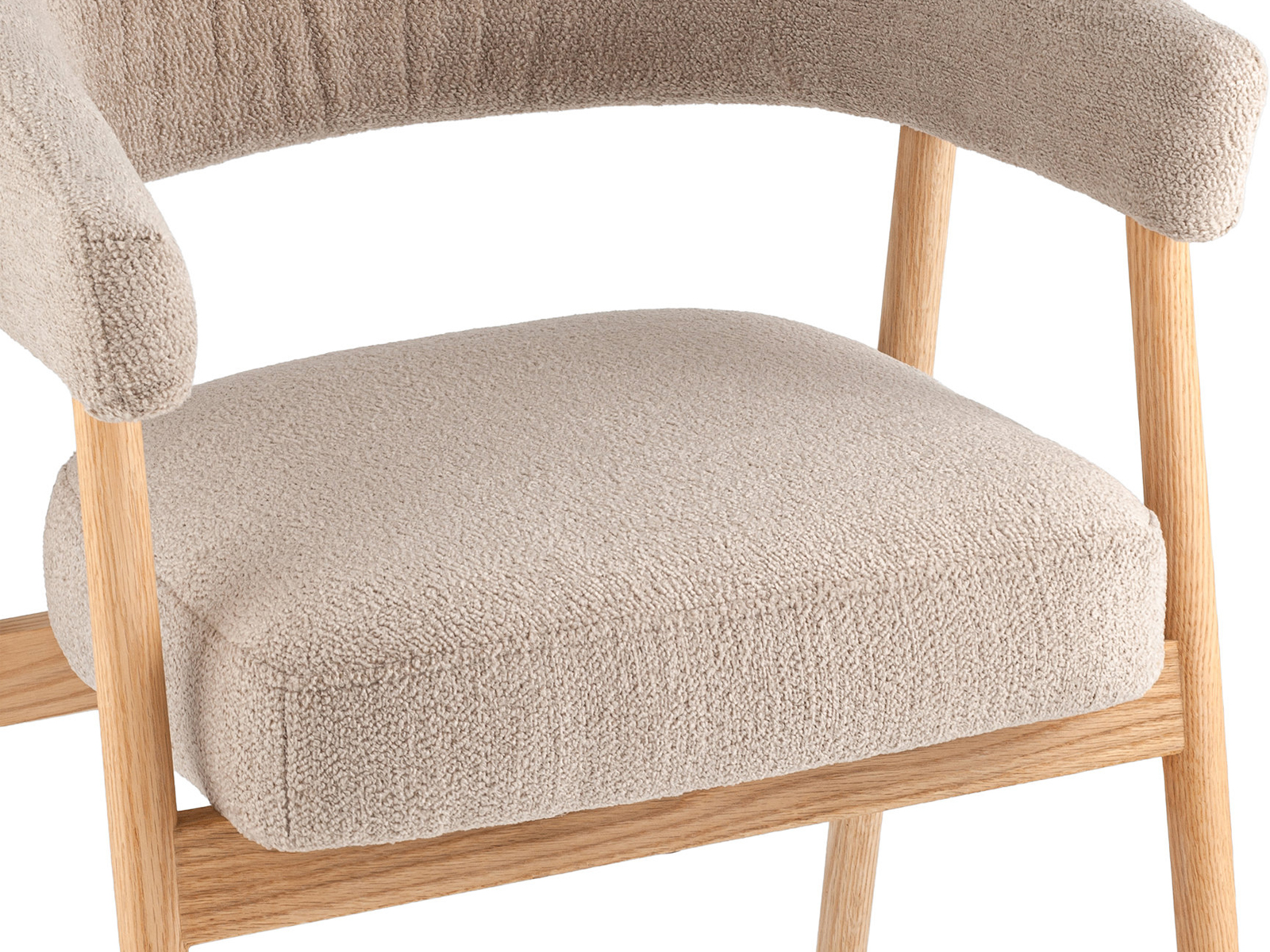Обивка выполнена из ткани букле — она приятна на ощупь, устойчива к истиранию и сохраняет свою привлекательность даже при активной эксплуатации. Ткань обладает лёгким рельефом, который придаёт мебели выразительность и делает её особенно уютной. Сиденье с наполнителем из поролона обеспечивает мягкость и комфорт при посадке.